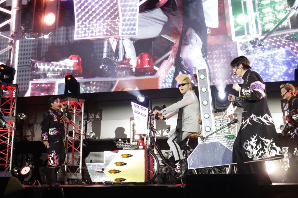 トーク中には『Osyan』がCD発売週のデイリーチャート1位を獲得した報告も舞い込んで、6人はLienと大喜び。そしてリョウガが「ここで綾小路 翔さんが、なんと本日応援に駆けつけてくださいました!」と告げると、氣志團の代表曲「One Night Carnival」のBGMをバックに、なんと電飾でギラギラに輝くデコチャリに乗って綾小路 翔がサプライズ登場した。