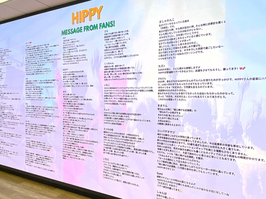 たった3日間の募集期間だったが、届けられた80通を超えるコメントには、温かい思いやほんわかしたエピソード、しっぽりした日常の風景から人生を動かした熱いメッセージまで、たくさんの声が脈を打っていた。ファンから届いたその声のリアルさとありがたさに感銘を受けたスタッフは、その声をスクリーンに映し出すかたちでHIPPYに届け、その様子を動画に収めることとした。映像制作は株式会社パブリックアートが全面協力し、巨大LEDが設置されたBARKS/LuckyFM/パブリックアート共用のカフェエリアが会場に起用された。