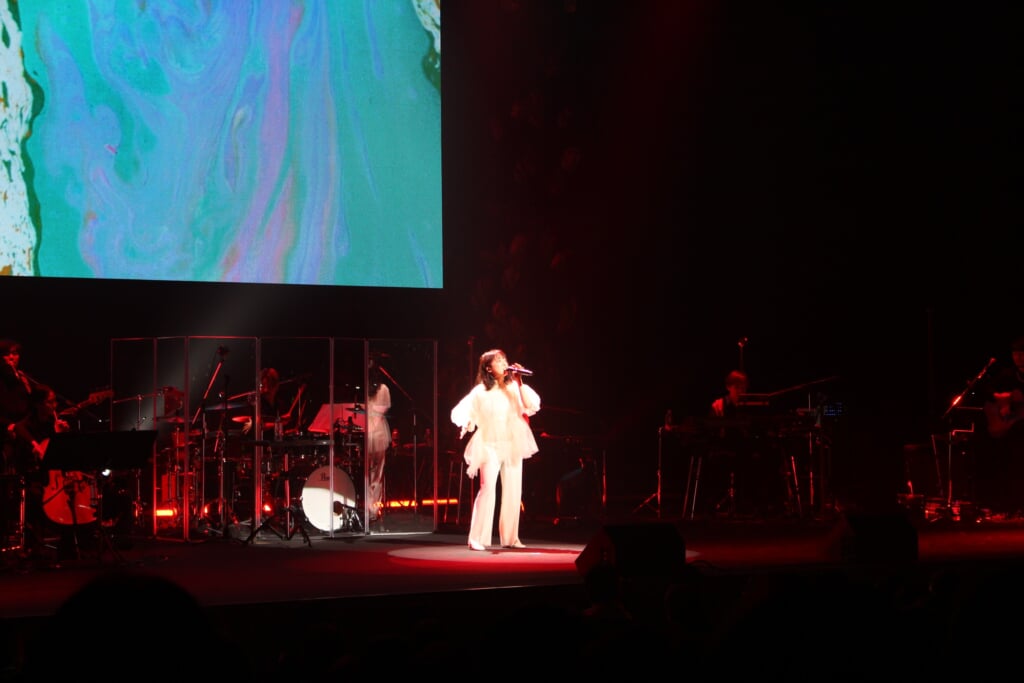 立ち見がでるほどの満員の客席のなか幕を開けた本公演。ステージには、なじみのバンドメンバーとともにカルテットのストリングスが並び、1曲目から会場をあたたかな空気で包んだ。『texte』の収録楽曲を軸としたセットリストからは、映像作品と音楽に対する深いリスペクトが感じられる。