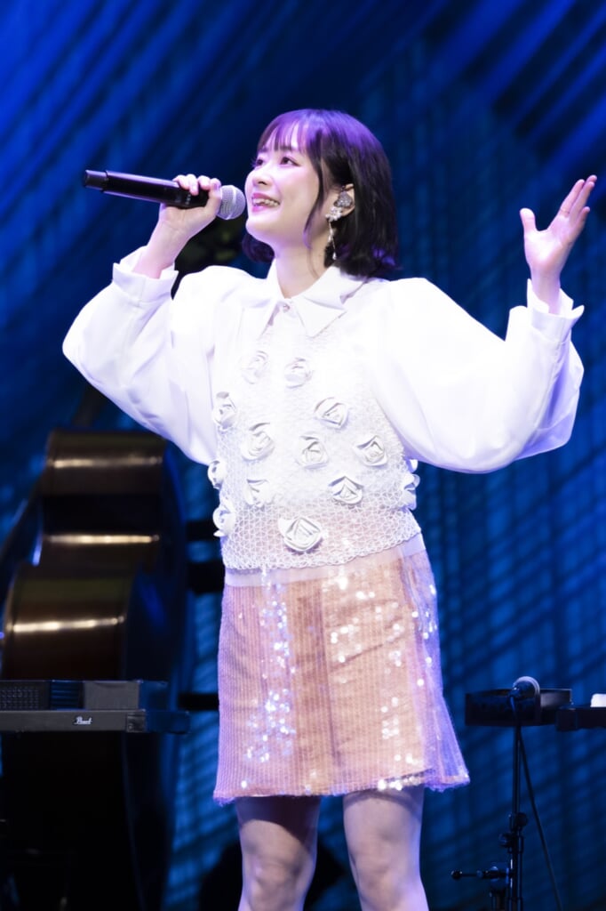 そして呼び込まれたのはトップバッター、大原櫻子。映画『猫の恩返し』主題歌、「風になる」の軽やかなイントロに乗せて、あたたかな歌声を響かせる。バンドマスターとして自身もピアノを奏でる武部をはじめ、バンドサウンドがとても心地好い。ステージ上のスクリーンには映画のイラストも映し出され、会場中がすぐさまジブリの世界へと誘われていった。さらに大原は「次の楽曲は、初めてカバーさせていただく曲です」と、映画『ホーホケキョ となりの山田くん』主題歌、「ひとりぼっちはやめた」を披露。ミドルテンポの弾むような歌声が幸福を運ぶように響いた。