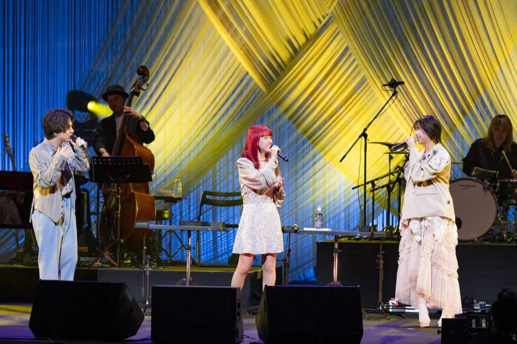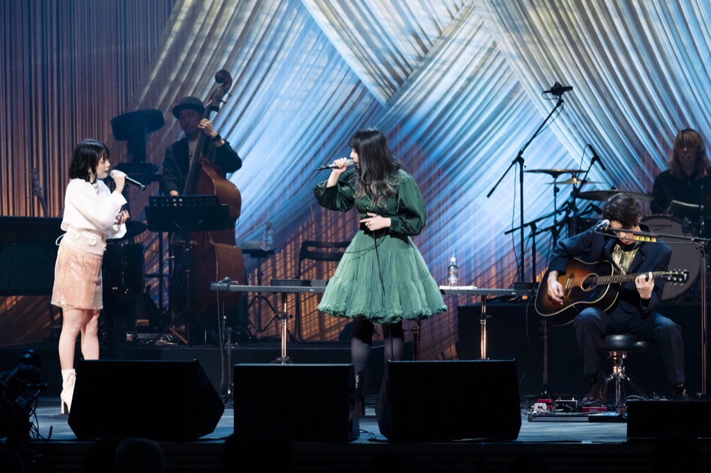 そして武部は「今日のショーでは、いろんな組み合わせのコラボレーションも楽しんでいただきたい」と語り、この日最初のコラボはGLIM SPANKYの松尾レミと亀本寛貴、そして大原櫻子の初共演。武部自身が映画音楽を担当した『コクリコ坂から』主題歌、「さよならの夏〜コクリコ坂から〜」で、松尾と大原のツインボーカルが響き合った。それぞれに違う個性のボーカルが溶け合うハーモニーは、まさにこの夜ならではのもの。