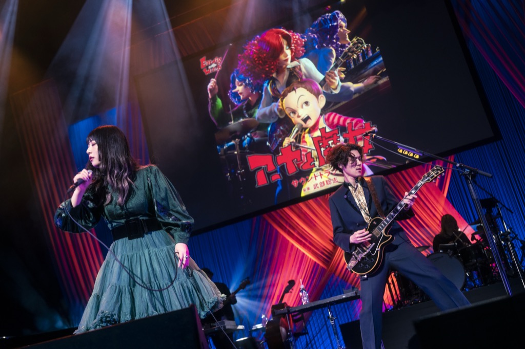 大原がステージをあとにすると、GLIM SPANKYのふたりは映画『アーヤと魔女』の主題歌「Don’t Disturb Me」を披露。亀本はギターをエレキに持ち換え、強烈に歪んだサウンドで会場の空気を一気にロックのモードに塗り替える。ハードなブリティッシュロックサウンドに松尾の歌声がとてもよく合う。続いては、映画『風立ちぬ』から「ひこうき雲」を披露し、深い歌声で会場を魅了。1コーラス目は武部と松尾と亀本の3人だけのアンサンブル。2コーラス目はバンドインのアレンジで、豊かな歌世界を表現していった。