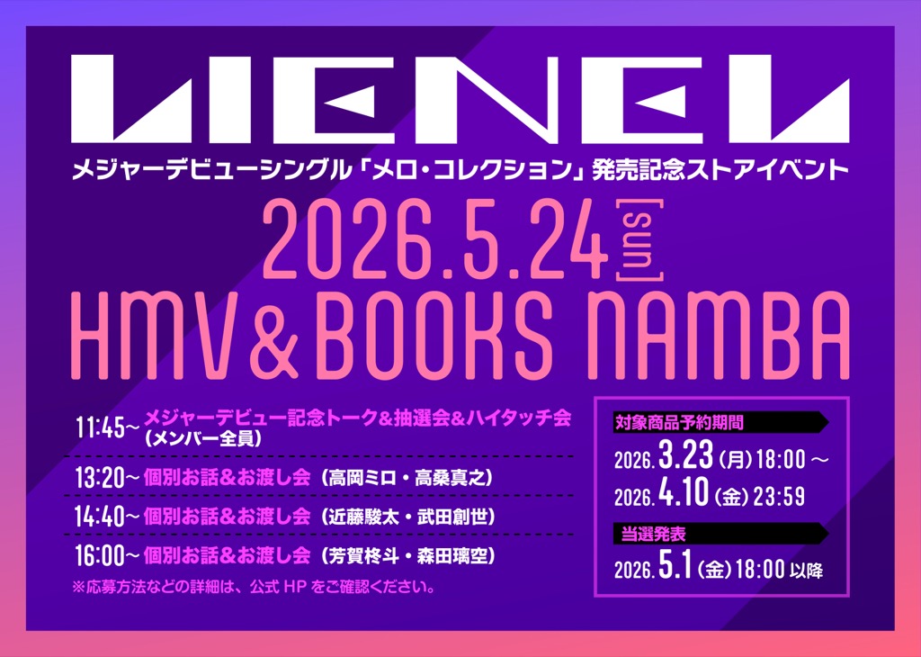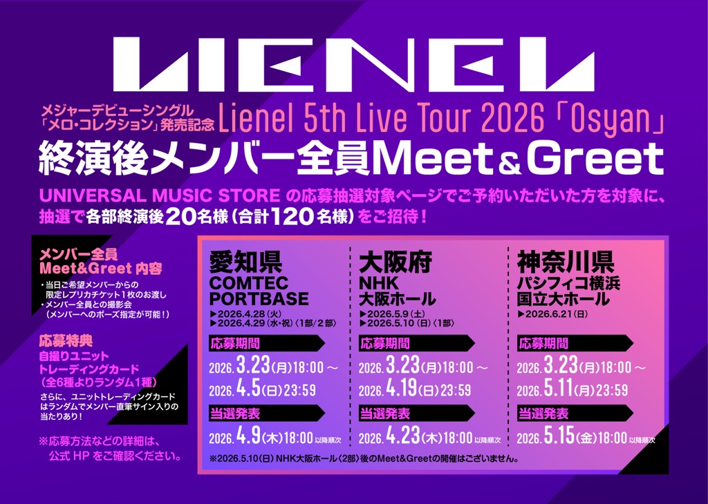 Lienel メジャーデビューシングル「メロ・コレクション」の発売を記念して、下記期間中に応募対象商品をご予約された方の中から抽選でLienel 5th Live Tour 2026「Osyan」終演後メンバー全員Meet&Greetへご招待いたします。詳細をご確認いただき、奮ってご応募ください。