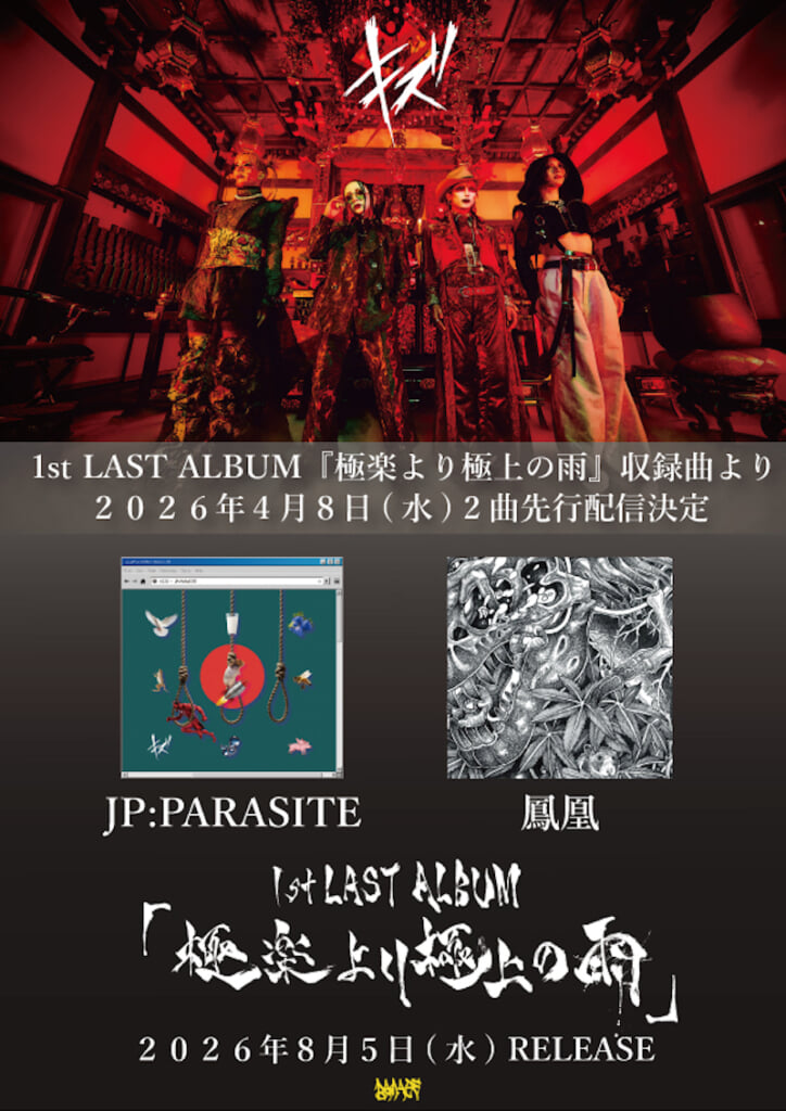 キズが、1st LAST ALBUM『極楽より極上の雨』の発売日を8月5日に延期することを発表した。なお、本作の発売延期は今回が2度目となる。
