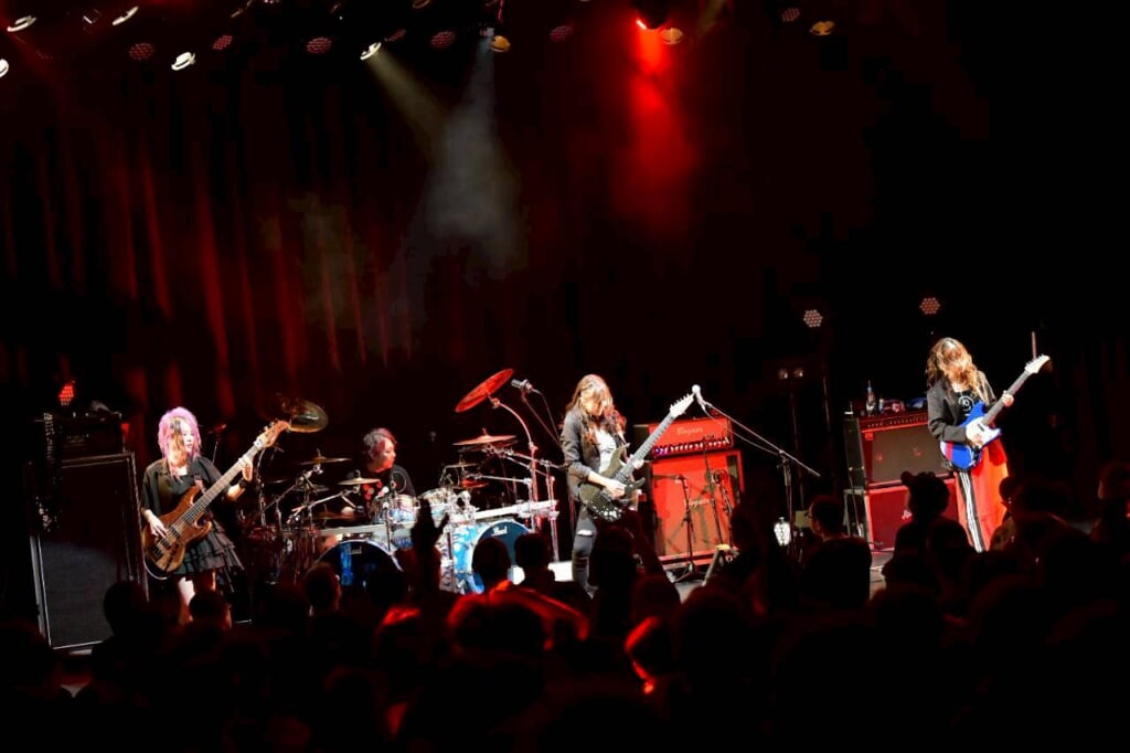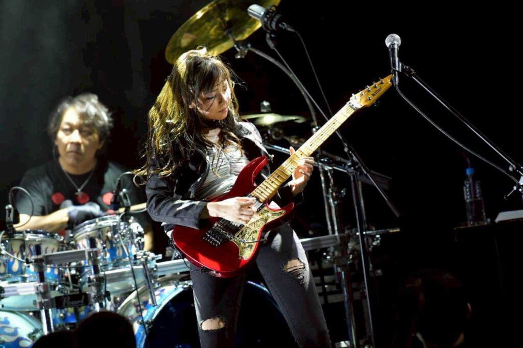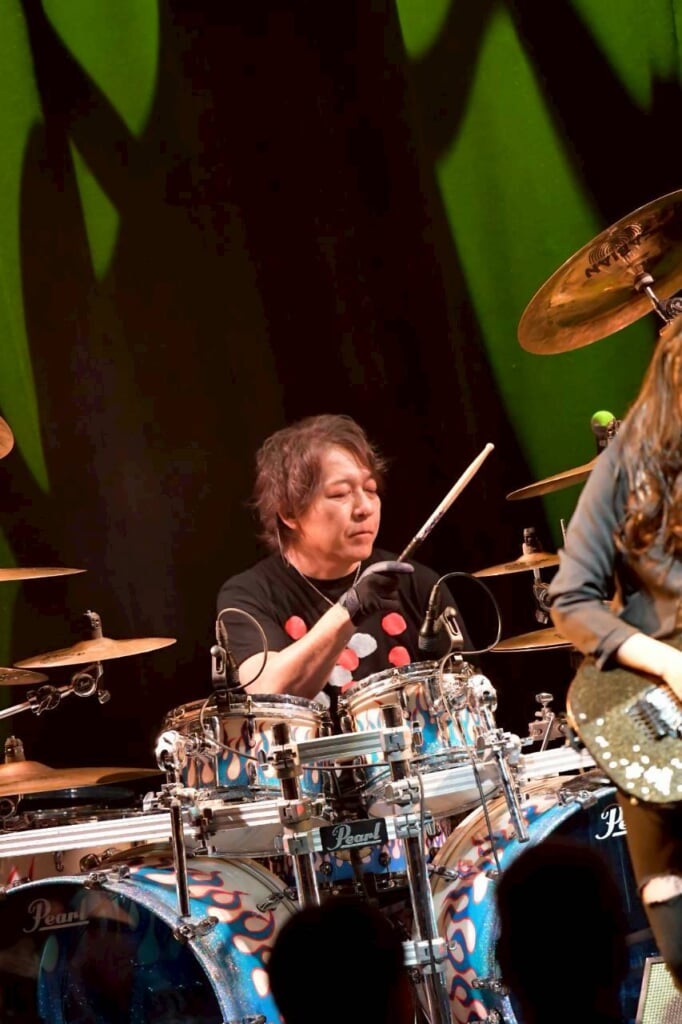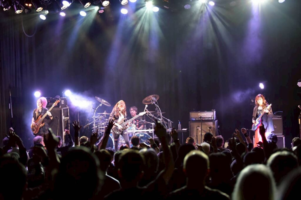 恒例の“名曲カバーコーナー”ではメンバーのソロプレイをふんだんに聴かせるシーンもあった。まずは、布袋寅泰による映画『キル・ビル』のテーマ曲「BATTLE WITHOUT HONOR OR HUMANITY」をカバー。SAKIが弾くメインテーマはもとより、shujiのテクニカルなドラム、ユニカインパクトによるスラップに続いて、はなの華麗なタッピングなど、トリッキーなソロパートが歓声を集めた。そして、shujiのド派手なフィルインにドッと場内が沸いた楽曲は、ジェフ・ベック「Led Boots」のカバーだ。ユニカインパクトのベースソロは凄まじく、はなの広がりのあるチョーキング、shujiの切れ味鋭いドラムプレイは秀逸。ユニカとはながドラムセットに集まり、その前でSAKIが演奏に没頭するシーンはカッコいいのひと言だ。今は亡きギターレジェンドへ捧げる見事なアンサンブルに大歓声が沸き起こった。
