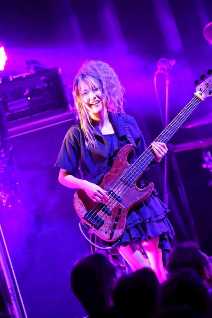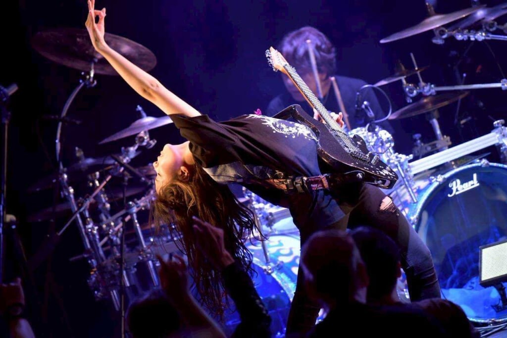 そしてSAKIが赤いボディーが鮮烈なKiller Guitars KG-Fascist Viceに持ち替えるとライブが再開。Mary’s Blood の楽曲「XOXO-kiss&hug-」のインストバージョンへ。フロントの女性3人が髪を振り乱しての熱演は圧巻。SAKIがステージ前方で体を大きく仰け反らし、ハイトーンで客席を挑発する。さらには高速2ビートな「Wings」を披露するなど、ライブ後半へ向けて会場が熱狂的なムードに包まれた。