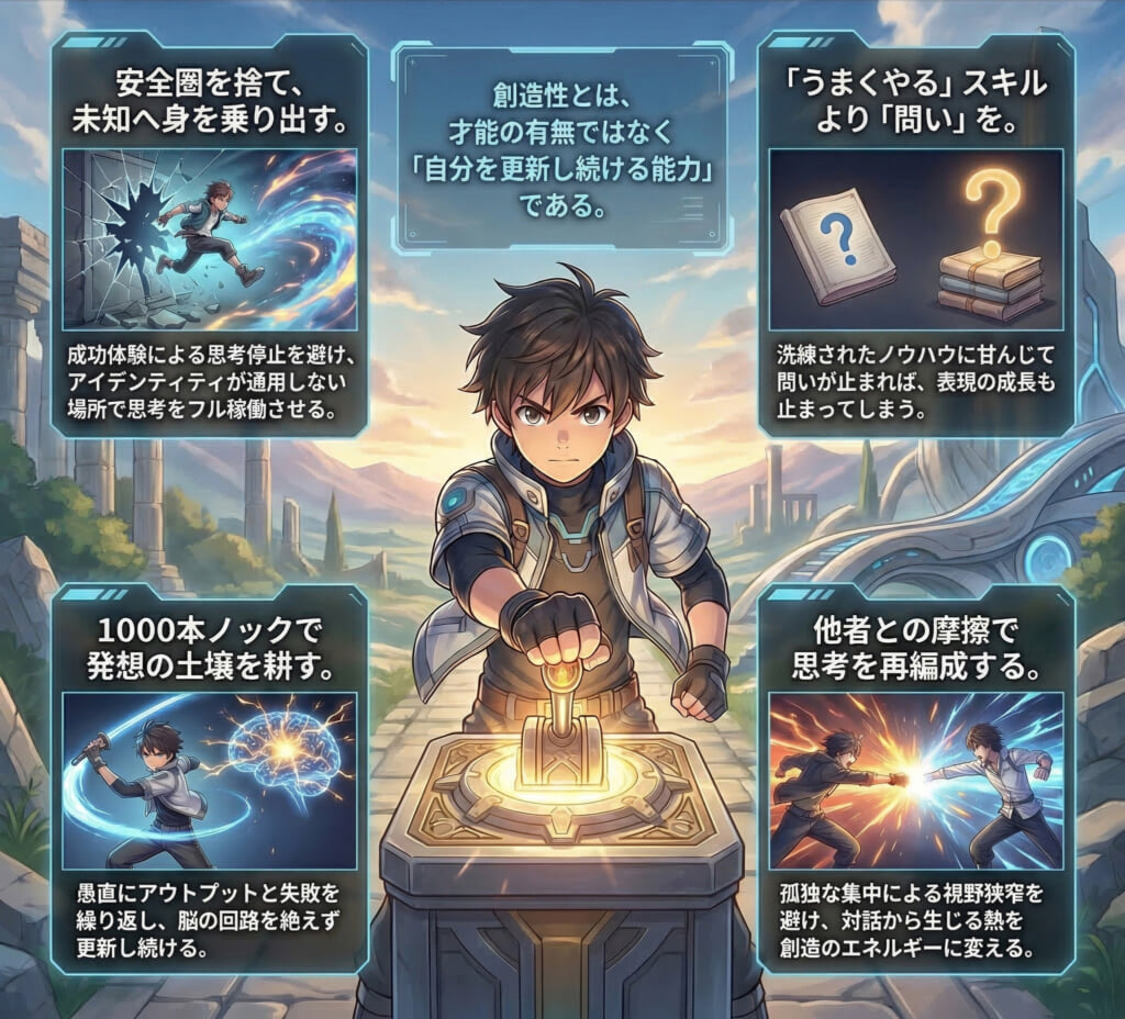 創造性を「一瞬のひらめき」と捉えるなら才能の有無が優位性を決めそうだけど、創造性=「更新を続ける地力」と捉えるなら、それは環境と習慣によって育まれる要素も出てくる。経験が増えるほど表現はより多層的に深みを増すと考えれば、創造性は誰でも一生更新できるものと信じられそうだ。若さは瞬発力を持つけれど、成熟は統合力を持つからね。