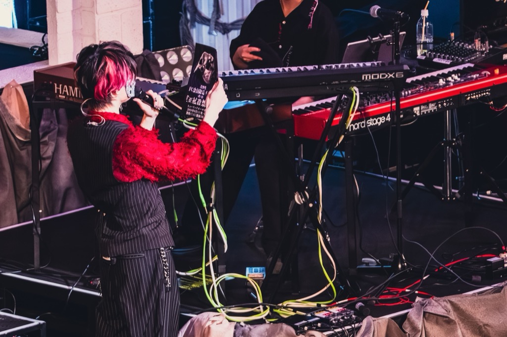 再び背景に黒幕が掛かると、ファルセットが憂いのあるメロディをウェットに映し出した「しあわせレストラン」、危険で妖艶なムードの「ラヴィブルーム」とたたみかける。ここであらためて痛感したのが、聴き手を歌詞に描かれた世界へと引きずり込む彼のボーカルの強さだ。高い粘度とざらついた質感を併せ持つ声は、吸い込むと瞬く間に全身に回る毒のようにこちらの思考を捕らえてしまう。さらに彼は音に関してただならぬ関心を持っているため、録音環境で磨いた音への美学や、声の響きを活かした歌唱もギミックになっていた。