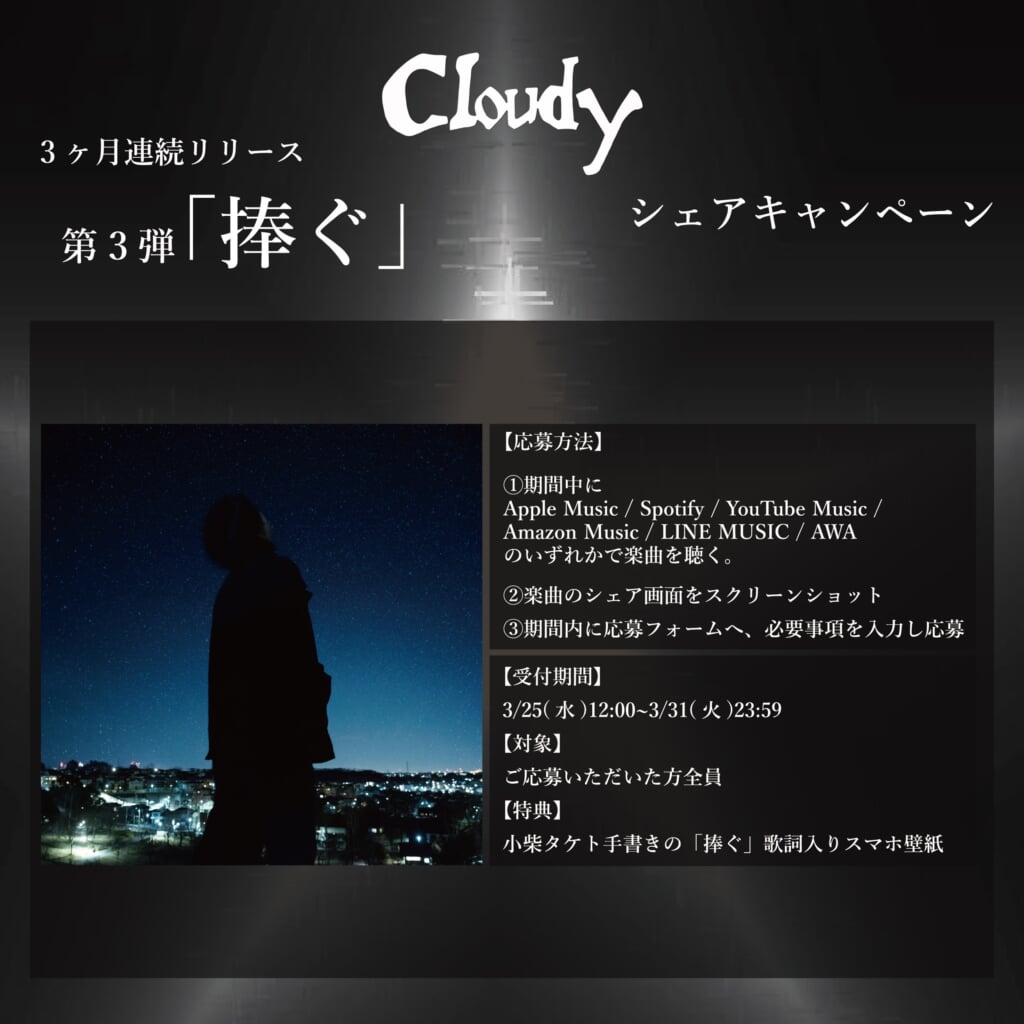 「捧ぐ」は、新環境を迎える方も多いであろう4月直前に届けられるCloudyからのメッセージソング。3ヶ月連続リリース企画の集大成でもある。この発表にあわせて、小柴の手書き歌詞入り壁紙を特典とした「捧ぐ」シェアキャンペーンを実施中だ。