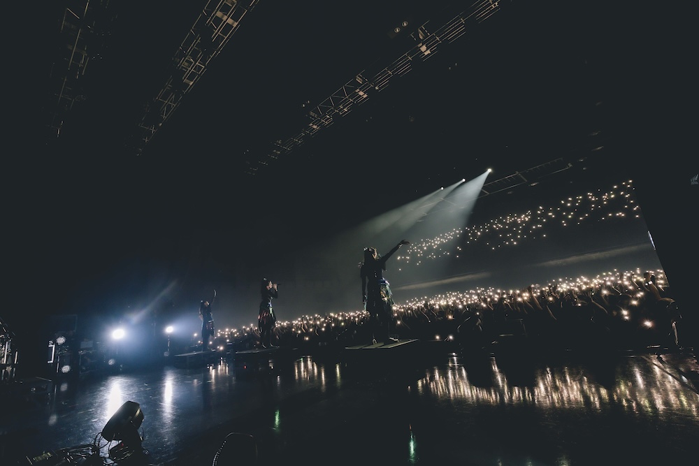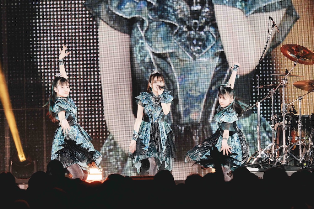 そしていよいよBABYMETALの登場だ。「BABYMETAL DEATH」のイントロにのってストーリームービーが始まると、会場の空気感が一気に変化し、まさに“儀式の始まり”といった様相だ。「DEATH! DEATH!」の掛け声と共に疾走するバンドサウンド、続く「from me to u(feat. Poppy)」ではキレキレのパフォーマンスを披露し、レジェンドソングの「ド・キ・ド・キ☆モーニング」も久しぶりに登場した。BABYMETAL史上、最もブルータルな「Song 3 (feat. Slaughter to Prevail)」、アゲアゲの「PA PA YA!!」、バンドソロを挟んで「メタり!!」、と立て続けにヒットソングが披露され、先日のさいたまスーパーアリーナ公演で初披露となった「Algorism」、客席がライトアップされた「Monochrome」などを終え、早くも後半戦に突入した。