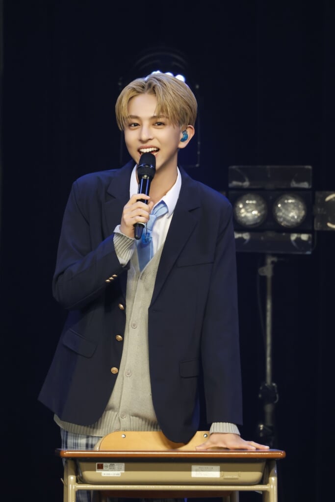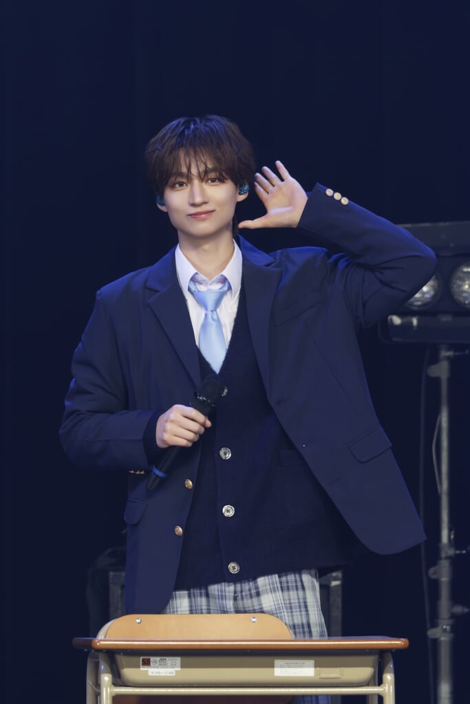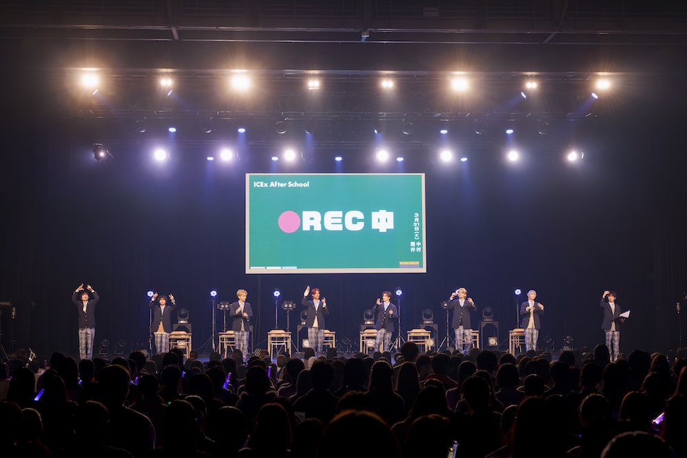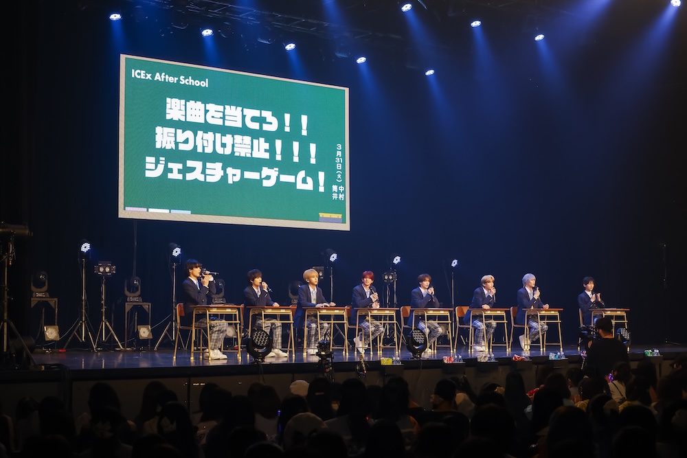 開演時間となり、場内が暗転すると、フロアには学校のチャイムが鳴り響いた。続いて、教室のように机と椅子が横一列に並べられたステージにブレーザーにチェックパンツという制服姿のメンバーが登場すると、満員の観客からの歓声が上がった。MCを務める中村の号令を合図にメンバーは着席。“ICEx After School”と題したイベントは、学校を舞台にストーリー仕立てのライブを展開した“ICEx School”をメンバーとともに振り返る「トークコーナー」からスタートした。