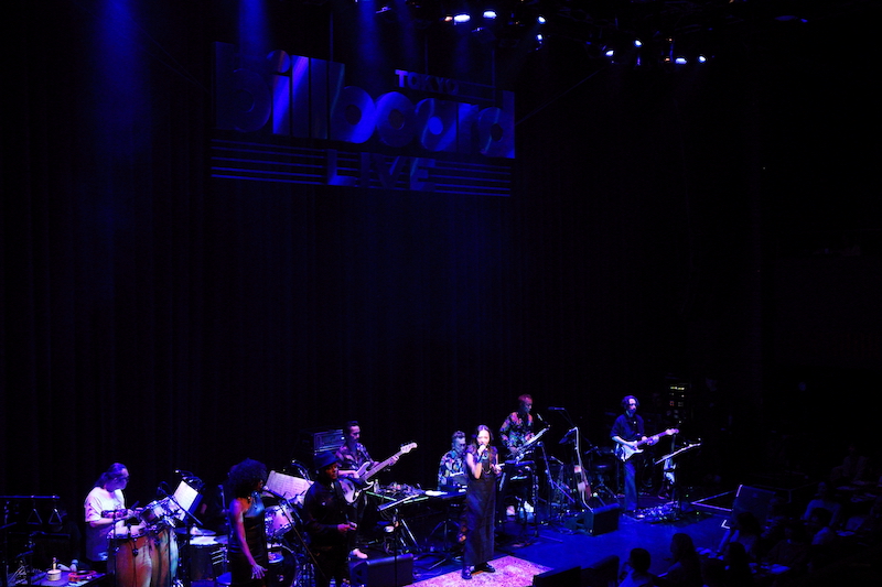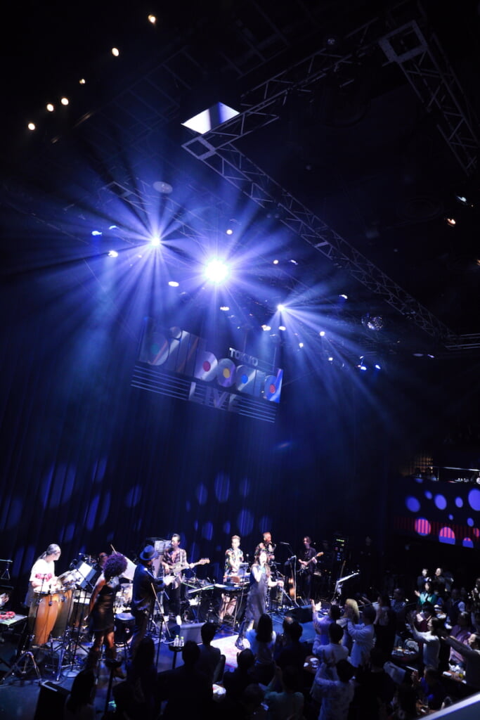リラックスムードのトークを経て後半戦は、アップテンポと代表曲を連発して会場を愉しませた。まずは「皆さんが聴いたことある曲から!」と、「Fly By Day」を披露。フィンガースナップでリズムを取りながら歌った杏里。間奏ではギタリストの植田浩二が、エモーショナルなギターソロをプレイして会場を沸かせた。ディスコチューンの「嘘ならやさしく」では、観客が総立ちになってクラップしながら体を揺らす。赤坂ムゲンの話題を伏線に、Kennyが叩き出すアツいビートが会場に広がり、ビルボードがクラブに早変わりした。