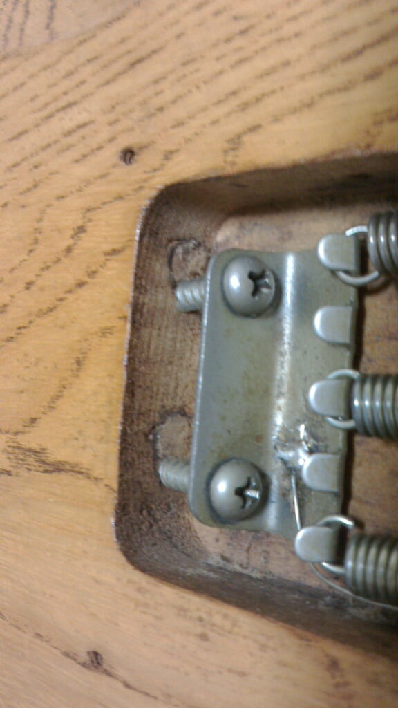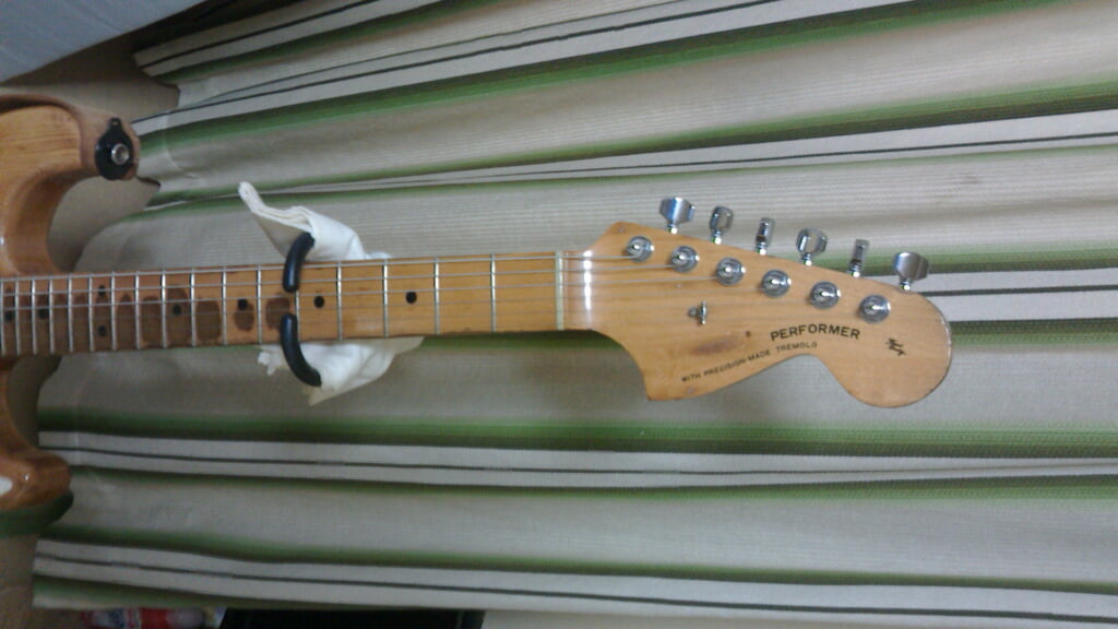 ペグは弦交換の際に弦を切って巻きたくないので巻いたあとで切れるゴトーの物に交換。ネックとペグをオールドタイプのものに交換したが普通の音になってしまい元に戻した。ブリッジはサドルはプレスタイプ、トレモロブロックがスチールの物に交換した。これまた自分でビスを交換し、ねじ穴がオリジナルでなくなってしまい嵌合が弱くなり、のちに大後悔する。