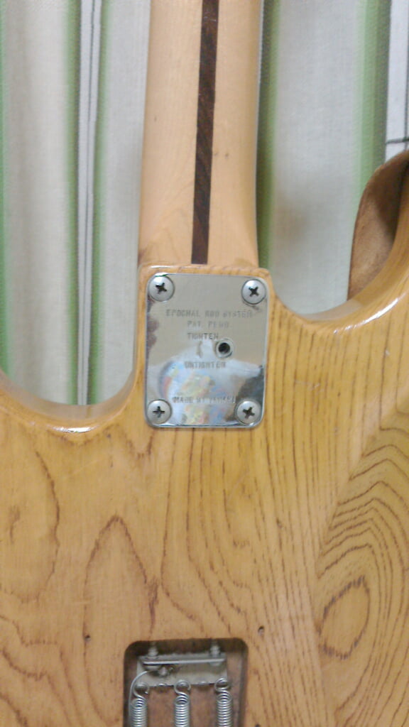 ネックジョイントプレートでトラスロッド調整が可能。指板は若気の至りでハイポジションを自分でかるいスキャロップ加工(のちに大変後悔した)リフレット2回、ストリングスガイドをフェンダーアメデラのに交換してもらった。インチサイズなので斜めに取り付けてある。