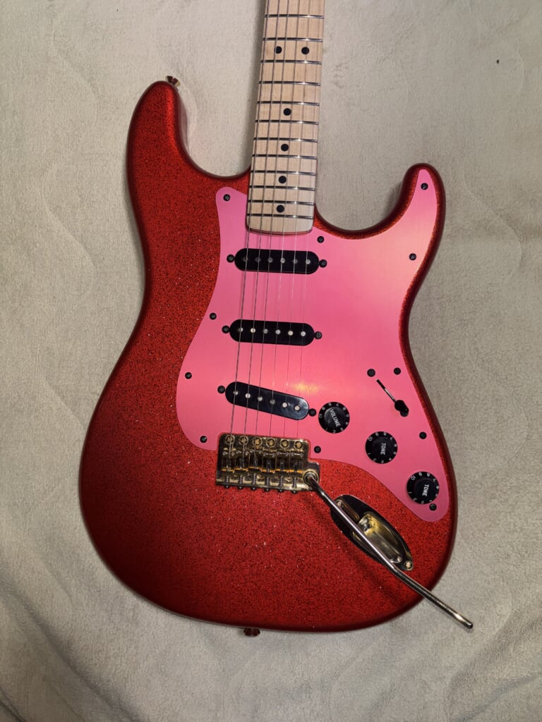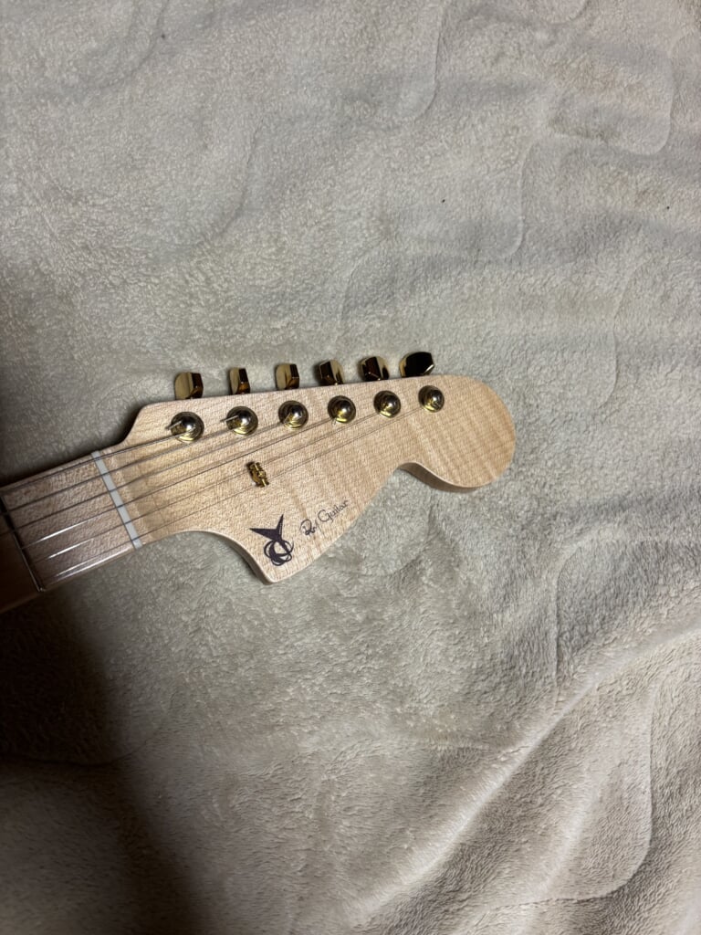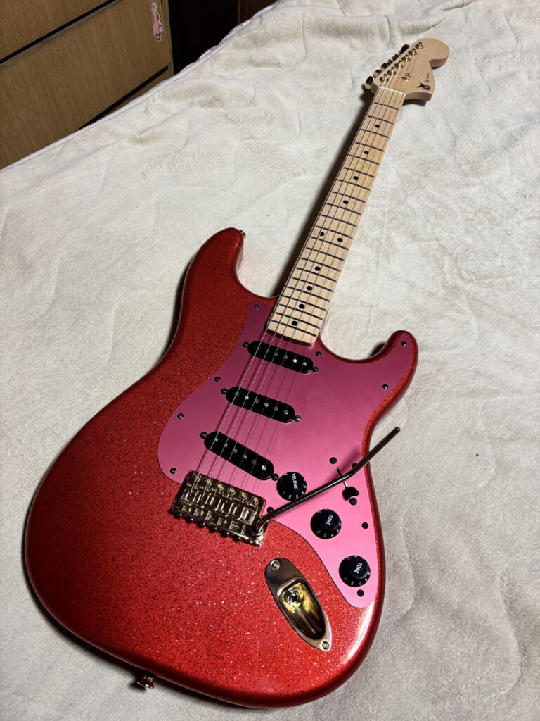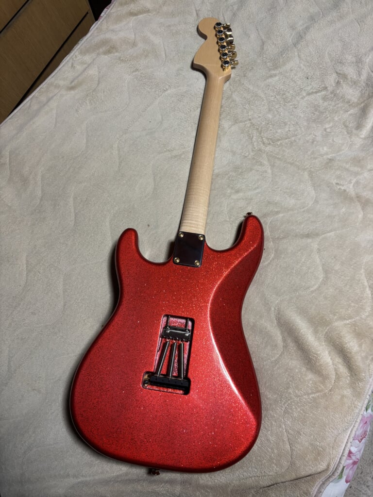 見た目はkenちゃんはやっぱ赤いギター、そしてラメ入りのメタリック!これはたまたまなのかRY GUITARさんがオーダーしてくれたのか真相はわかりませんがネックに少し虎目が入っているんです!眼福すぎます!今度は絶対に売りません。大事にします!