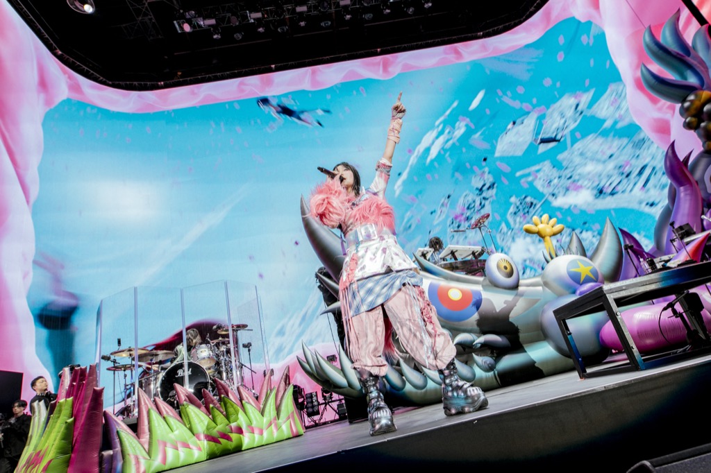 2日目に登場したのはYOASOBI。「アイドル」からステージは始まり、ikuraの放つ圧倒的なカリスマ性はスタジアムを埋め尽くす観衆を飲み込むほどの輝きを放つ。「たぶん」では会場中のスマートフォンのライトが灯り、幻想的な光景が広がる中、ikuraの透明な歌声が響き渡った。「ONE OK ROCKさんへ、最大のリスペクトと愛と感謝を込めて」と語るikura。「群青」での感動的な大合唱を経て、ラストの「夜に駆ける」まで、Ayaseが生み出す緻密なサウンドがスタジアムを鮮やかに彩り続けた。