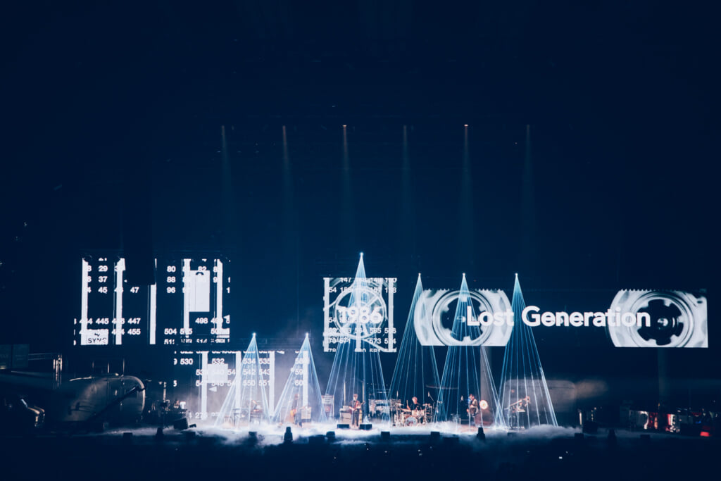 ここで再び6人編成に戻ったところで、「世界中にはいろんな暮らし方の違い、考え方の違いがあるけど、俺たちの音楽で少しずつ、シェアできるものを増やしていって──この道路はきっと、みんなが暮らしてる道路のどこかに繋がってると思ってるから。そんなことを考えて組んだステージです」と今回の舞台セットについて後藤が語る。「音楽の可能性っていうのは、鳴らした音楽のメッセージが世界を直接変えたりすることではなくて。考え方の合わない奴とか、生まれた場所も全部違う誰かと、短い人生のこの時間をシェアできること──“どこか似たところがあるんだ”って実感できることだと思う。そういう方が、音楽の本当の力なんじゃないかなと思います。一緒のメロディで踊って“なんかよかったね”って帰ってくれたら、俺たちは嬉しいし。その気持ちがちょっとずつ、みんなの生活を豊かにしたり、悲しいことを緩ませたりしてくれたらいいなと思ってます」……そんな祈りにも似た想いが、「さよならロストジェネレイション」「転がる岩、君に朝が降る」で壮大なサウンドスケープを描き出していった。