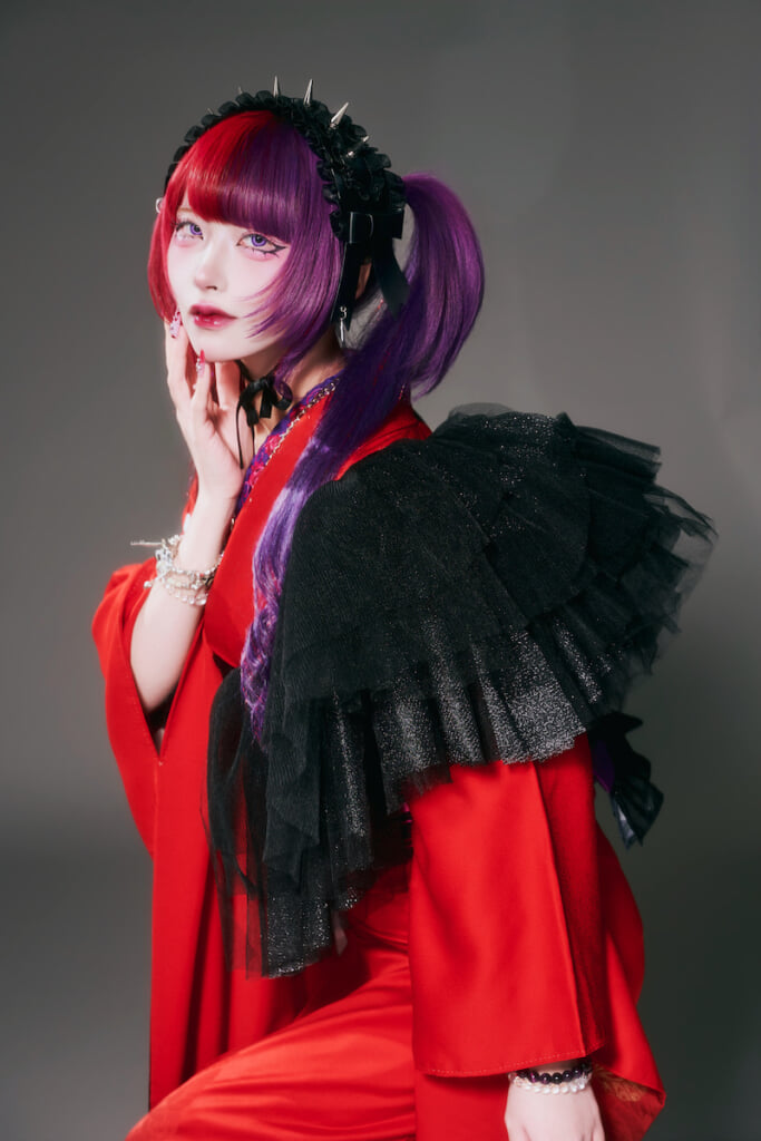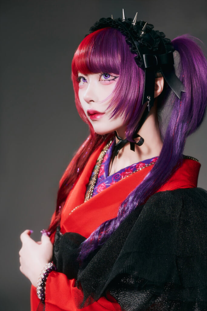 石川:ホムラさんがいろいろ着物を羽織ってるの見てるけど、暖色系じゃないのよ。irocaも暖色は使わないんです。今回の振袖は朱色系だけど、マゼンタ系の赤のほうがもっと似合うと思う。irocaもそうなんです。基本的にマゼンタとか紫とか、あとライムカラーとかね。寒々しいというか、クールトーンなんですよ。そういうのが彼女は似合うんですよ。だから本人も赤や紫の髪色をチョイスしてるんじゃないかな。これが黄色やオレンジの頭だったら、イメージ変わっちゃうと思うんだよね。お母さんはどっちかっていうとそっちだもんね。