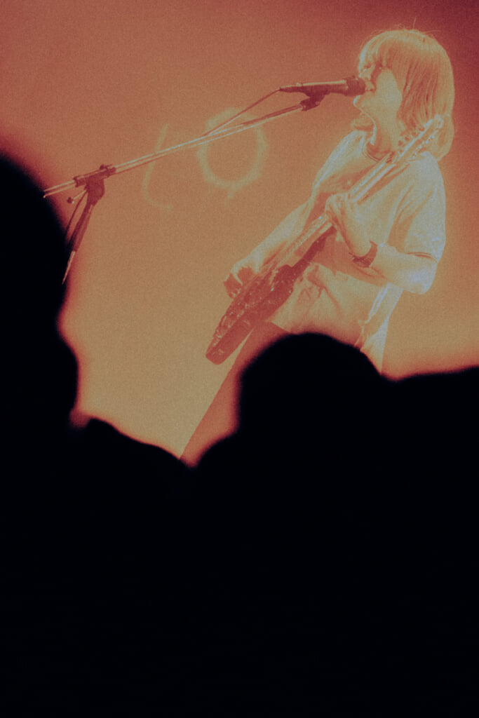 お風呂場で開催される反省会さながらにマナミのぼやきたちが薄暗いフロアに飛ばされた頃、「わたし」という一声でオオスカ(G, Vo)へスポットライトが注ぐ。2025年9月にリリースした2ndアルバム『fragile Report』の入場者特典としてプレゼントされた47都道府県ツアー<アウトストアで47>と、同ツアーのマイルストーン的な役割を果たした<Re:TOUR>、この日の“生BGM”を担った神々のゴライコーズと共に駆け回った<fragile Report RELEASE TOUR>の総決算となるこの夜の開幕曲は「fragile report」だ。
