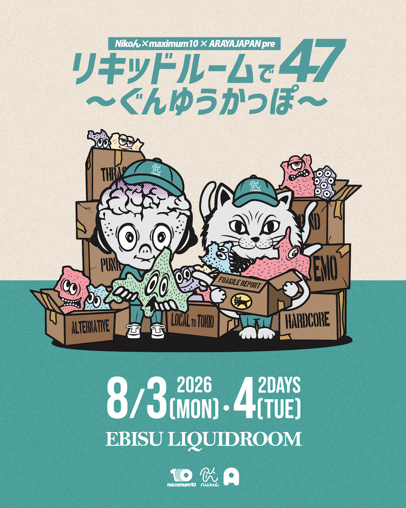 なお、Nikoんは“全国各地、想い想いの活動を行い、牙を研ぎ、機を窺っているたたかう者たちを全国各地から一堂に恵比寿に集める”という意志のもと8月3日(月)・4日(火) に<Nikoん × maximum10 × ARAYAJAPAN pre「リキッドルームで47~ぐんゆうかっぽ~」>を開催する予定だ。