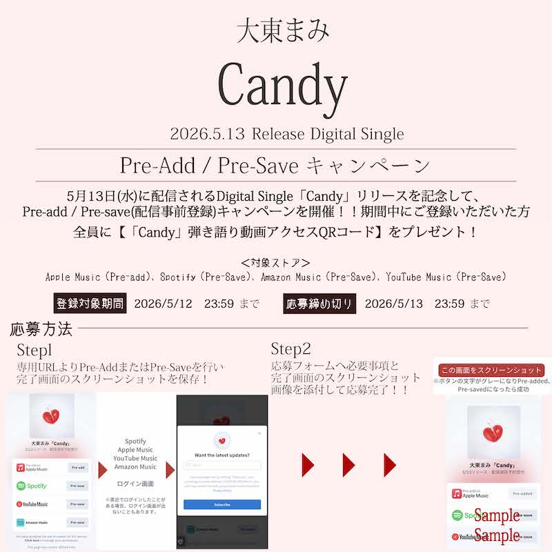 さらに、「Candy」のリリースを記念して、Pre-add / Pre-save(配信事前予約)キャンペーンを開催。期間中に登録した人全員に、「Candy」の弾き語り動画が視聴できるアクセスQRコードがプレゼントされる。ライブでも未発表の新曲で、今回が初公開となる。