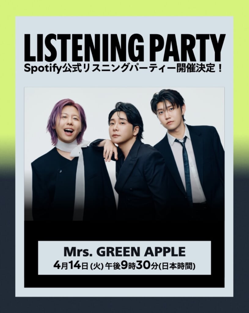 「風と町」の配信リリースを記念して、Mrs. GREEN APPLEメンバー全員参加のSpotify公式リスニングパーティーを開催することが決定!