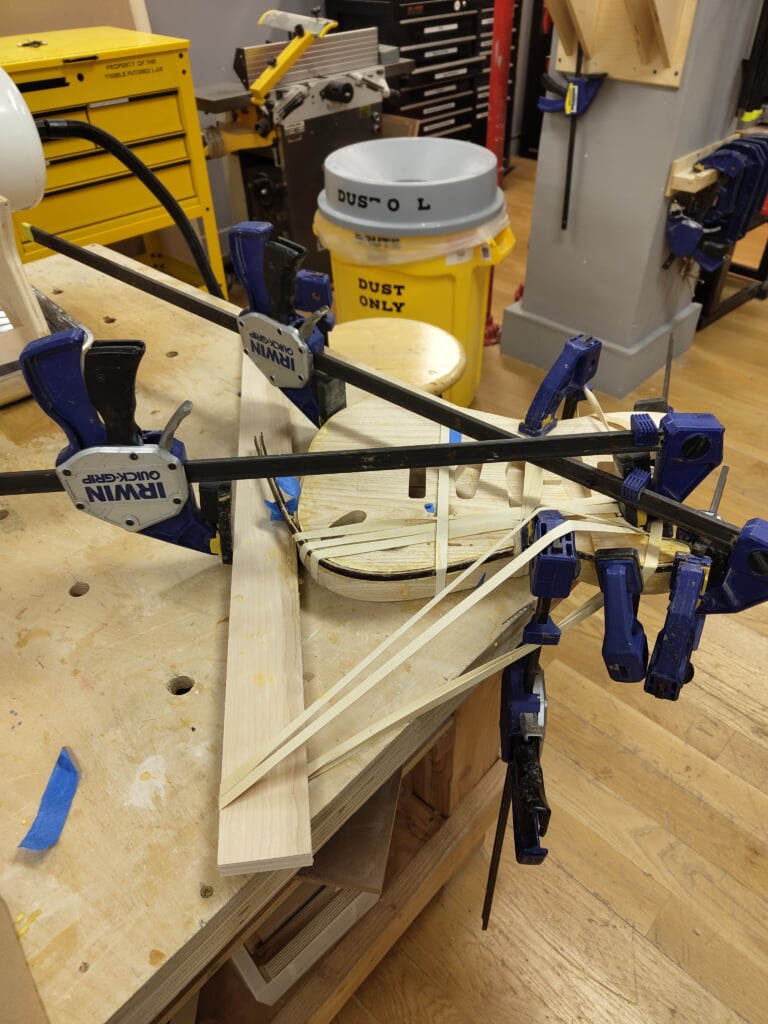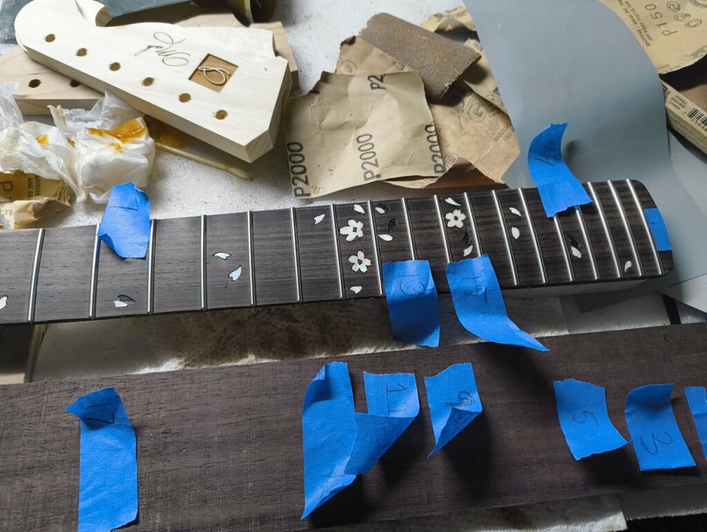 今回はナチュラルフィニッシュで作りたかったので、その上で桜の要素を足してみました。ボディーのインレイも思ってたより綺麗に見えて安心です。ナチュラルフィニッシュは家具感が強い分、工夫して所々デザインで補ってみました。