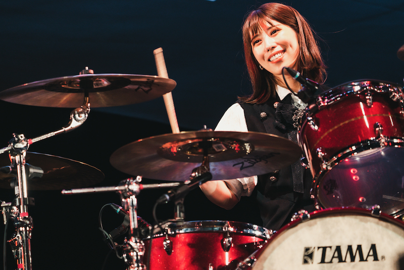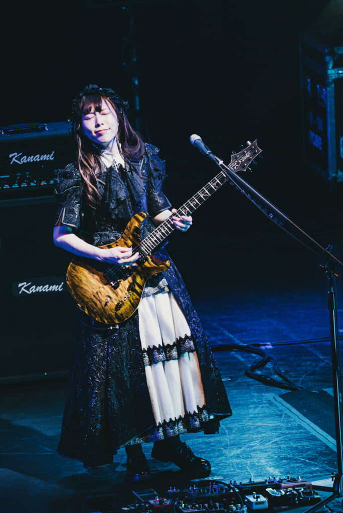 そういえばひとつ、大事なことに触れるのを忘れていた。BAND-MAIDのお給仕には欠かせない「おまじないタイム」で、この夜、ちょっとした驚きがもたらされたのだ。小鳩ミクの独壇場になるはずのこの場面において、AKANEが、さらにはMISAが「萌え萌え、キュンキュン」の儀式に加わったのだ。この流れでいけば、ツアー先のどこかで今度はKANAMIが……などという想像も頭をもたげてくるところだが、おそらくステージの進行表にも記されていないはずのこうした自由度の高さ、臨機応変さは、それこそ彼女たちが繰り広げるセッションの楽しさにも重なるところがあるように思う。音楽とは直接関係のないこのようなシーンにさえもバンド力の高まりを感じずにはいられないし、逆に、こうした緩和の要素があるからこそ緊張感のある演奏もいっそう際立つことになるのだ。