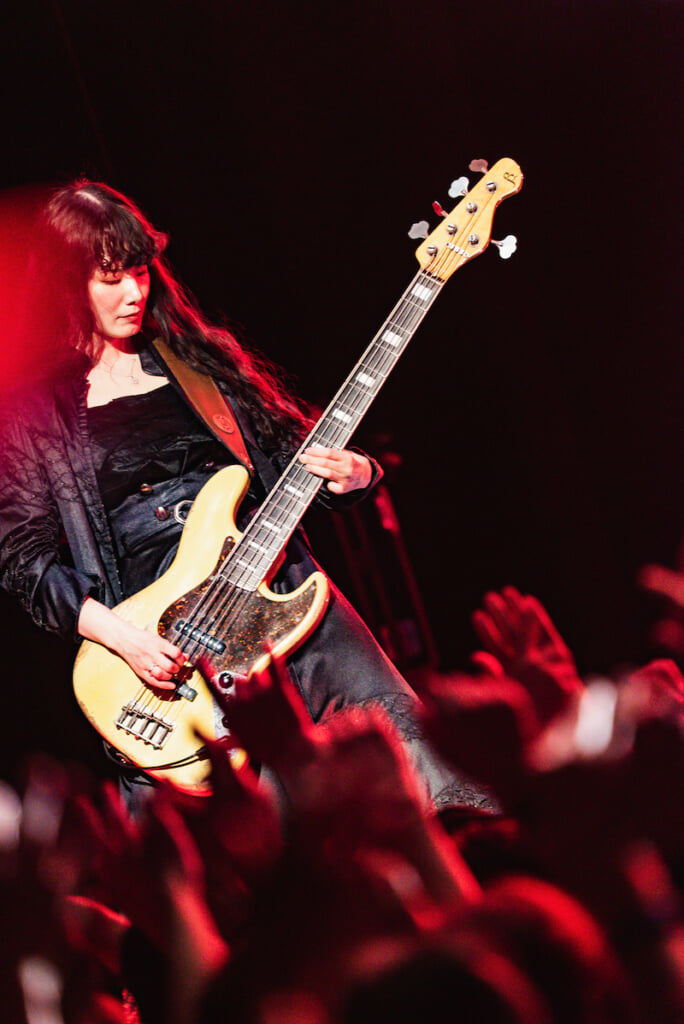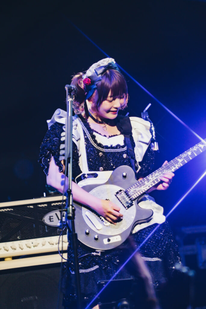 まず序盤のうちに「いつもと違う」と感じさせられたのは、バンドサウンドの聴こえ方だった。具体的に言うとMISA(B)のベースの響きがこれまで以上にソリッドでフレーズが明確に聴こえ、KANAMI(G)の奏でるギターの音と対を成しながら攻めてくるように感じられたのだ。それもあってか、ただでさえタイトなAKANE(Dr)のドラミングもいっそうタイトに響いてくる。もしかするとそれは会場の音響環境によるものなのかもしれないと思っていたが、のちに判明したのはMISAが最近、ベースの音作りを変えたということだった。具体的にどういうことなのかは後日また改めて確認してみようと思うが、時間経過と正比例の関係で整合性と説得力を高めてきたBAND-MAIDのバンドサウンドに、また新たな変革が起きているのだ。