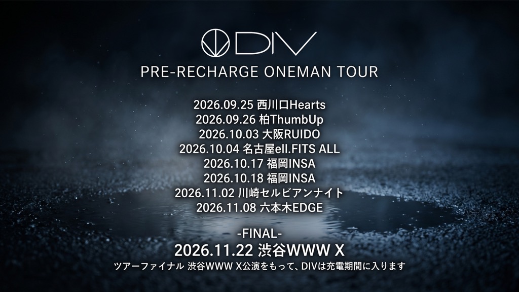 充電に先立ち、9月25日より全国ワンマンツアー<DIV PRE-RECHARGE ONEMAN TOUR>が開催される。本ツアーは、これまでの活動を経て到達した現在地を提示すると同時に、その先へと向かうための重要なライヴシリーズとなる。