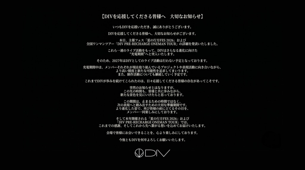 DIVが新たな全国ワンマンツアーの最終公演日となる2026年11月22日をもって、次なるフェーズへ進むための“充電期間”に突入することを発表した。2027年は充電に専念し、ライヴ活動は行わない予定だ。