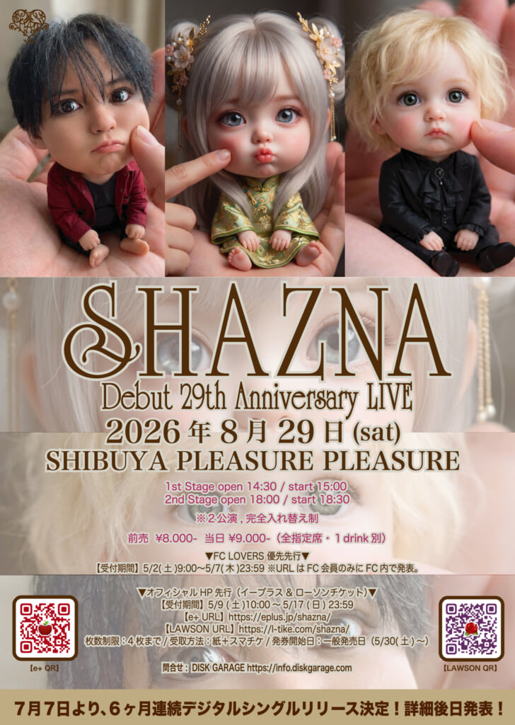SHAZNAが、7月7日より6ヶ月連続デジタルシングルをリリースするほか、2026年内ライヴスケジュールが続々発表となった。