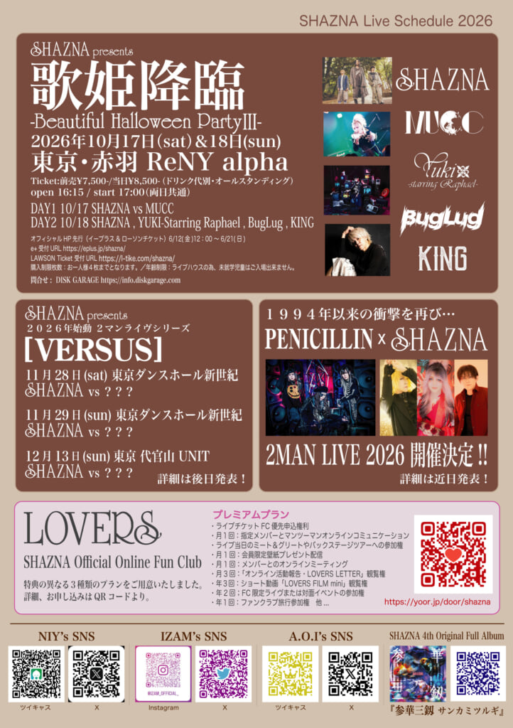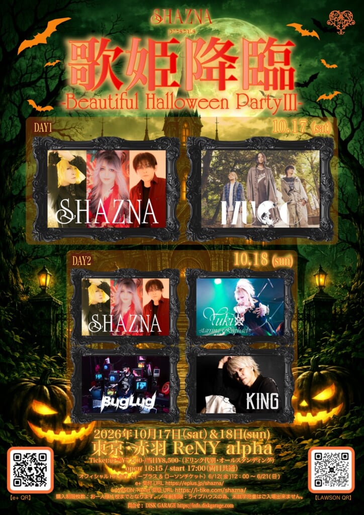 そして毎年恒例のハロウィンイベント<歌姫降臨 〜Beautiful Halloween Party III〜>が10月17日および18日、東京・赤羽 Reny alphaで行われる。その初日は“SHAZNA vs MUCC”のツーマン、二日目はSHAZNAに加えて、YUKI-Starring Raphael、BugLug、KINGの出演が決定している。
