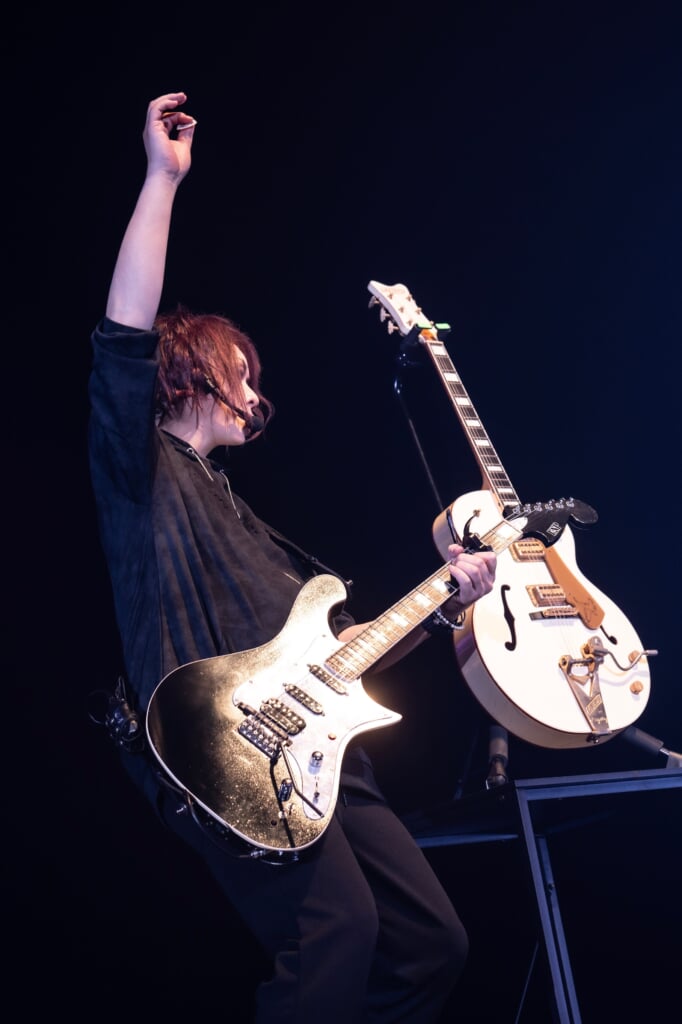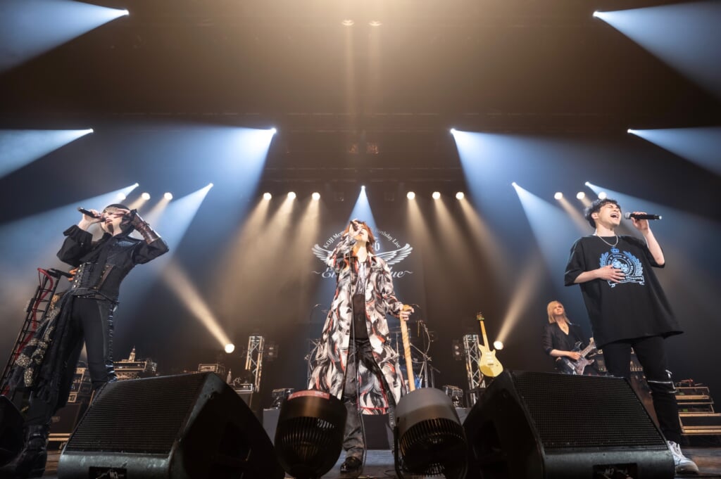 そんなアンコールらしいムードの中、「鳩が飛んできました」とTAKAらしい言い回しでmichi.とShotaがステージに呼び込まれ、トリプルボーカルで披露されたのは、KOJI作曲の代表曲「未来航路」。KAZUKIがKOJIのようにギターリフを背中弾きで披露し、同曲エンディングではSHUSEがベースをマイクスタンドに擦り付けるおなじみのパフォーマンスも飛び出した。