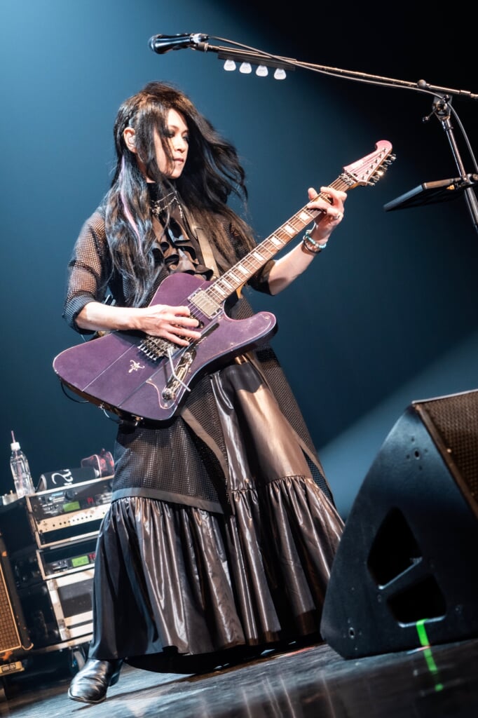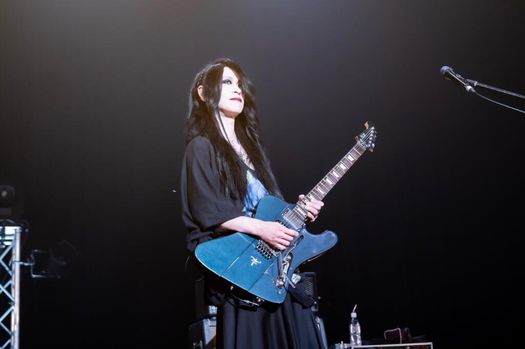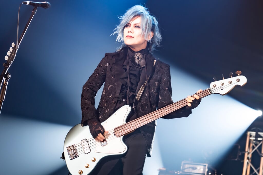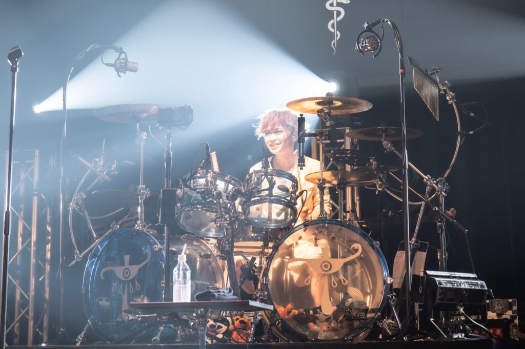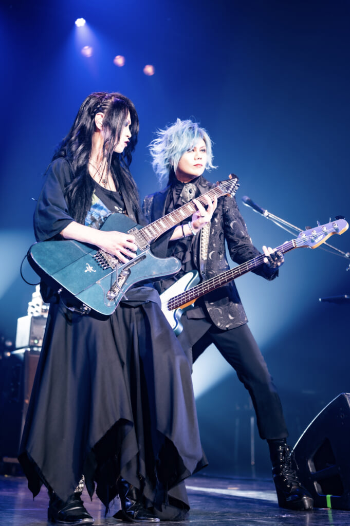 ひときわ大きな歓声の中、ライヴはLEVINのパワフルなドラムから始まる「PRIDE」で幕を開けた。名盤『magic theatre』収録曲の「Subconscious Desire」はSHUSEのベースがうねるイントロダクションから神秘的な情景を描いていく。KOJIオリジナルモデルのKILLER KG-Marquisが飾られたステージで、KOJI作曲の2曲が立て続けに演奏された。