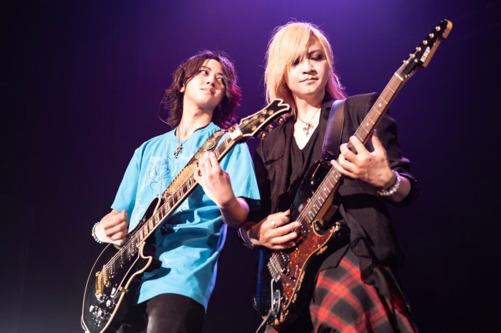 そして、アンコールではもうひとつのサプライズとKOJIが繋いだ奇跡が待っていた。TAKAが「ここでKOJIの宝物を呼びます」とKOJIの息子であるKAZUKIをステージに呼び込んだのだ。ギターを抱えたその姿は、遠目から見るとスタイルも仕草も“KOJIか!?”と思ってしまうほど。「温かい目で見守ってください」とTAKAが呼びかけ、KAZUKIがイントロのアルペジオギターを奏でて、La’cryma Christi + KAZUKIの編成で「偏西風」が届けられた。