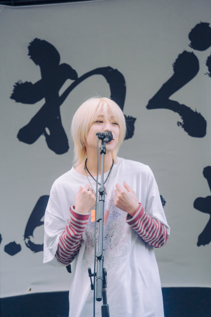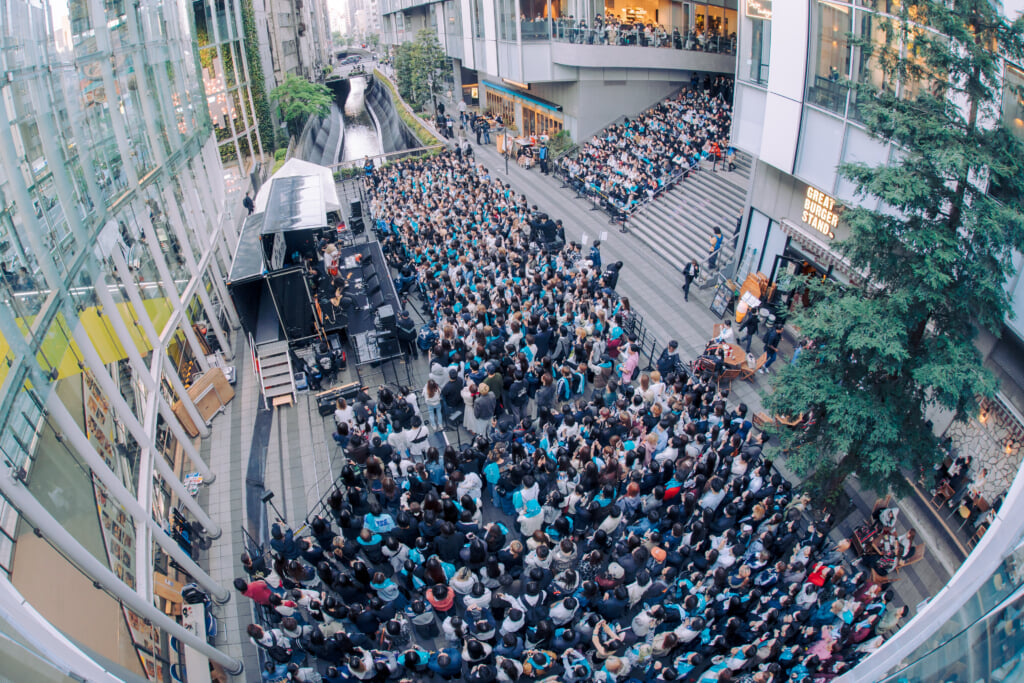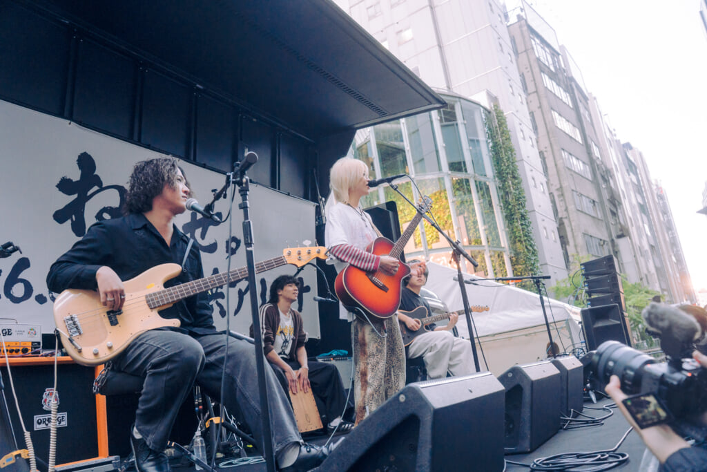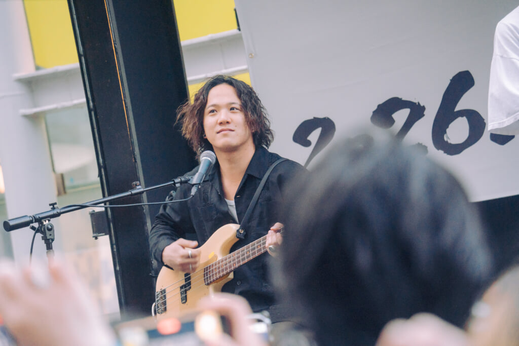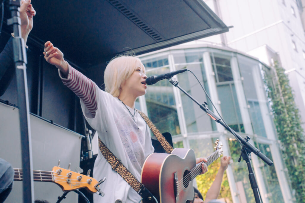 メンバーもファンも、慣れないシチュエーションではあるだろうが、りょたちが「ライブハウスやもんな、ここも」と口にしていたように、始まってしまえばあとはライブを楽しむだけ。曲始まりにはファンも「1, 2!」と大声でカウントを合わせたり、りょたちが「聴かせてくれよ!」と投げかければすぐさまシンガロングも沸き起こる。これはメンバーとファンが積み上げてきたものであり、人通りがとにかく多い駅近の超一等地に響くグッドミュージックと大歓声に、得も言われぬ高揚感がオープンエアーを満たしていく。