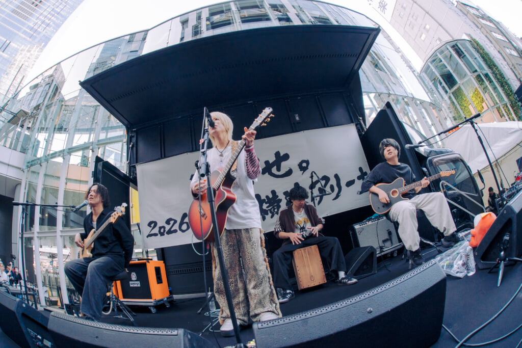 「喋っておこう、せっかくだから」とりょたちが話したことをきっかけに、少し長めのMCタイムへ突入。渋谷にまつわるエピソードとして、メンバー自身がよく行く店も近くにあるというトークを披露しつつ、「ねぐせ。ってバンドやってます、皆さ〜ん!」とりょたちが道行く人へ呼びかける。さらに、「いつもはアコースティックじゃないです。いつもは18個ぐらい叩くものがあるのに、今日は1個!」とドラマーのなおとがアピールするなど、心をほぐすような軽妙なトークもフリーライブを盛り上げる。そして、りょたちの歌い出しで大きな歓声が生まれた「愛してみてよ減るもんじゃないし」のアップテンポで軽快なサウンドが、盛り上がりを加速させた。最後のMCでは、改めて横浜アリーナ公演への意気込みが語られた。