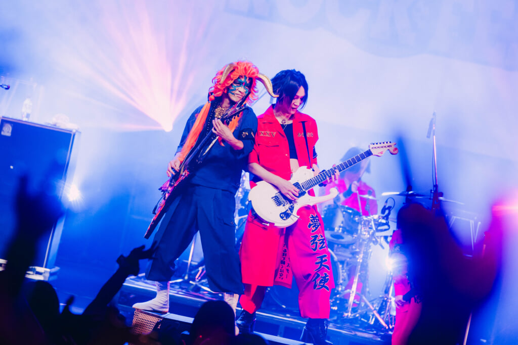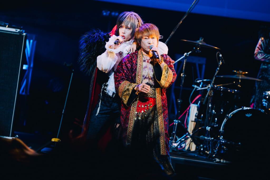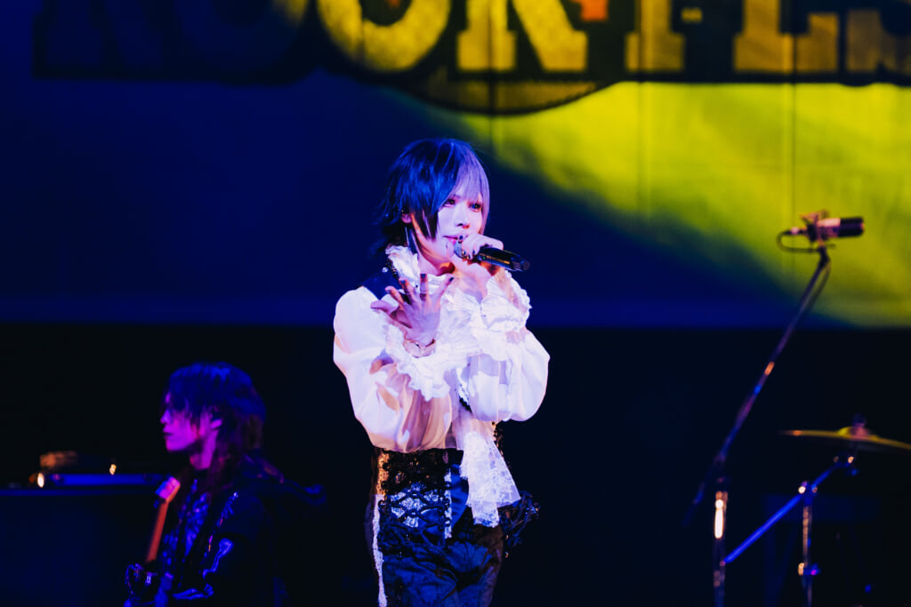 そこへトップバッターを務めたのは、0.1gの誤算。キャリア豊富なほかの出演バンドの中では、若手と言ってもいいだろう。そんな違いを味方につけた緑川裕宇のライヴ運びが見事で、DAISHI (Psycho le Cému)を迎えた「絶望メンブレガール」では先輩に容赦なく、「2ステップって知ってる?」「やってみろ、50歳!」と言い放ち、MCでNIGHTMAREのセットリストについて触れたかと思うと、バンギャの観客に、自分もヴィジュアル系を知っていると猛アピール。ハチャメチャな一方、きっちり準備してきたのだろうと真面目ささえうかがえるだけに、その人柄には好感しかない。