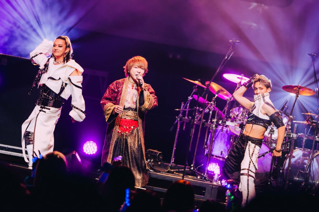 ここで、次期最高指揮官であるDAISHI、Lida、AYA、seekの4人の神様が、ナーガと戦おうとするお芝居が展開されるが、この物語がどうなるのか、ナーガを倒すことはできるのか、ナーガの毒におかされたYURAサマは助かるのか、まだまだ謎は続いていくようだ。そして、この神様たちの世界観を投影している楽曲「シャクティシャクティアスティ」。ダンスの振り付けをしたENVii GABRIELLAのHIDEKiSMとKamusも登場、華麗なダンスを披露した。なかなか複雑な振りではあるが、初見の観客も含め大勢が踊ろうとしているのも印象的だった。その後、seekのおなじみ「かかってこい!」のMCからは、ひたすら激しく盛り上げていく。「LOVE IS DEAD」で、YOMI (NIGHTMARE)が登場。DAISHIと並んで歌う姿は、背格好が近いせいもあるのか、兄弟かユニットかそんな雰囲気が漂う。同時に、YOMIの歌声の存在感を改めて感じられるシーンでもあった。