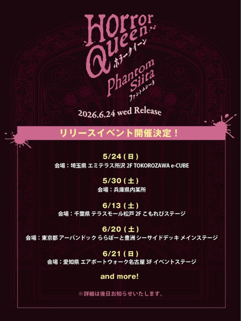 さらに、『ホラークイーン』の発売を記念して、各地でリリースイベントの開催も決定した。イベントの詳細は順次公式サイトにて発表されるので、続報をお待ちいただきたい。