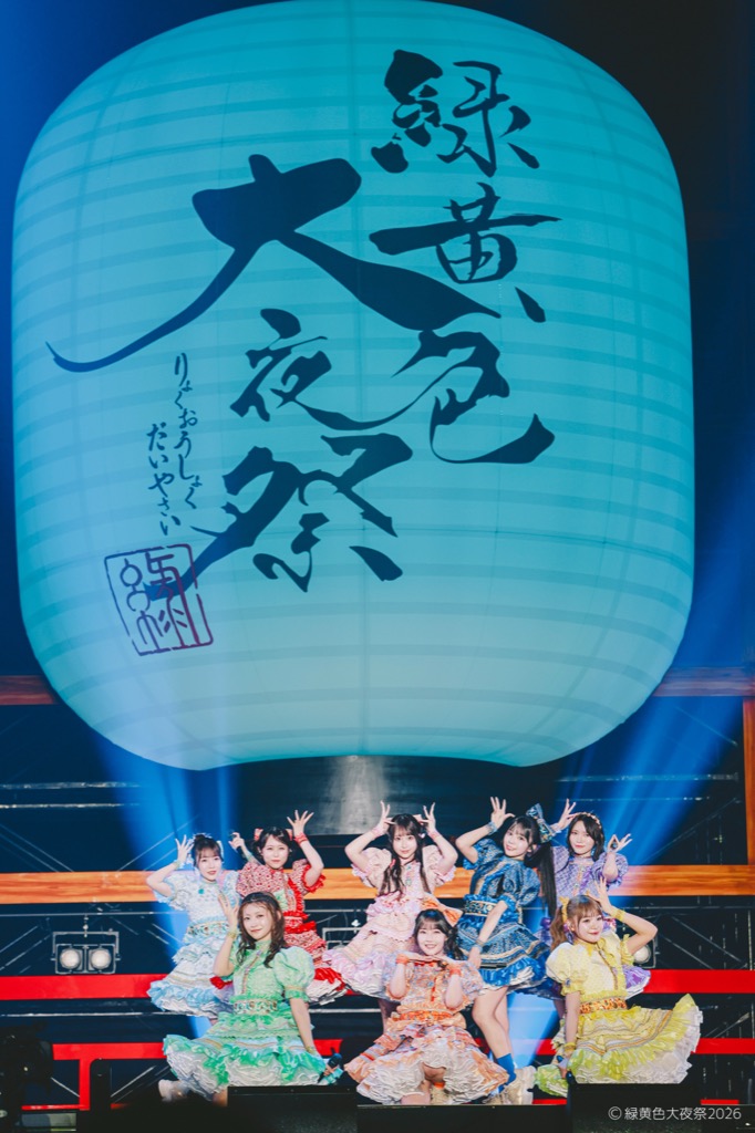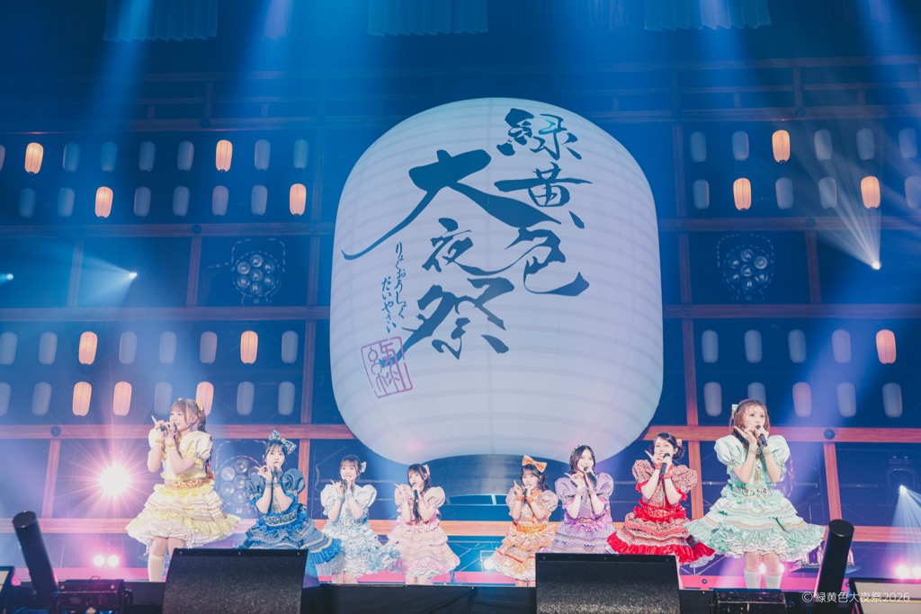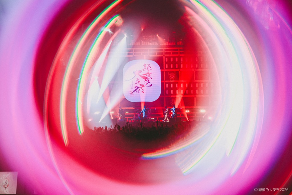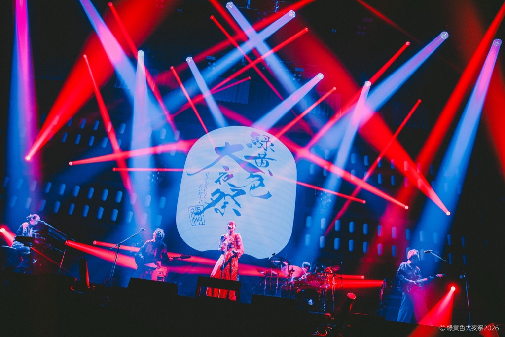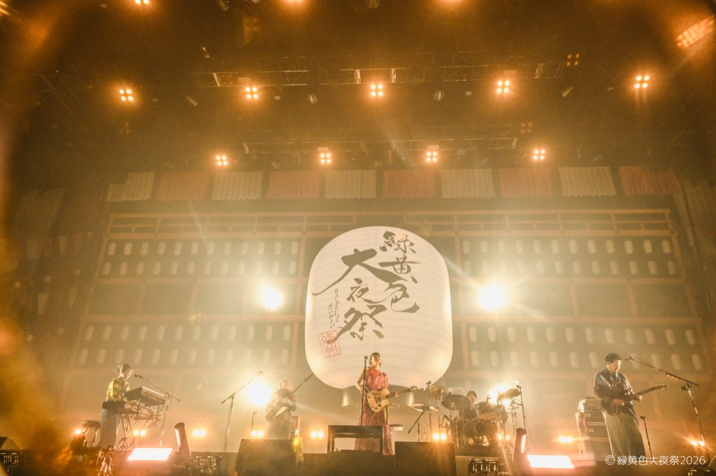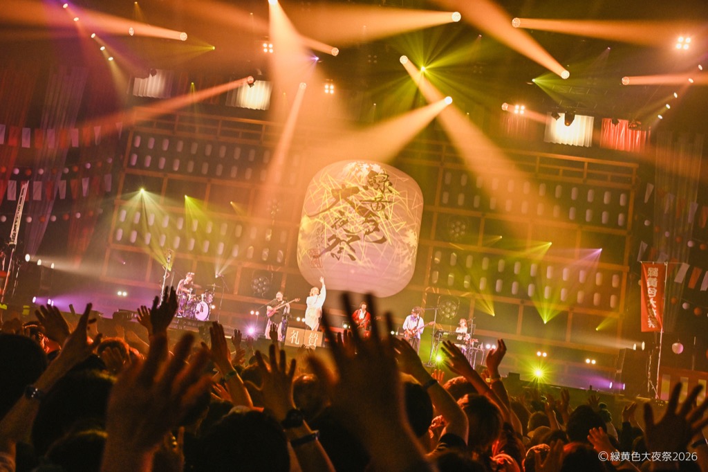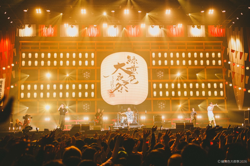 会場内には「にぎわいひろば」と名付けられた無料エリアも設置され、緑黄色屋台(フードエリア)や射的・輪投げ・転がし屋などが並んだ縁日ブースなどがあり、さらに場内には大きなやぐら、ステージには提灯や和太鼓も設置され、会場はまさに「祭」の装い。チケットは2日間共にソールドアウト。無料エリアを含み、2日間で30,000人の観客が会場に詰め掛けた。そんな2日間にわたる<緑黄色大夜祭2026>の模様をオフィシャルからのレポートでお届けする。
