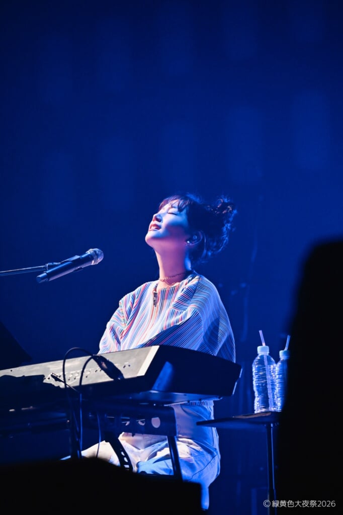 ステージに登場するやいなや、楽屋から持ってきたバンド名入りの提灯を掲げてみせたのは、この日3組目に登場したスキマスイッチ。冒頭から「ガラナ」「ユリーカ」と、サポートバンドと共に力強く端正な演奏で披露。MCでは「常滑でこんなにライブできるとは!」と感慨を露わに。というのも、スキマスイッチもまた、今回の<緑黄色大夜祭2026>と同じくAichi Sky Expoで「スキマフェス」を2024年に開催しているのだ(そのとき、緑黄色社会も出演)。愛知県東海市出身、まさに「ド地元」だという大橋は、「ボクノート」「奏(かなで)」と名曲たちでその圧巻の歌声を響かせる。ラストを飾った「全力少年」では、ステージサイドに設置された和太鼓を大橋が叩き、バンドと無邪気なセッションを奏でる場面も。まさに「全力」で音楽を奏で、駆け抜ける、爽快なステージだった。
