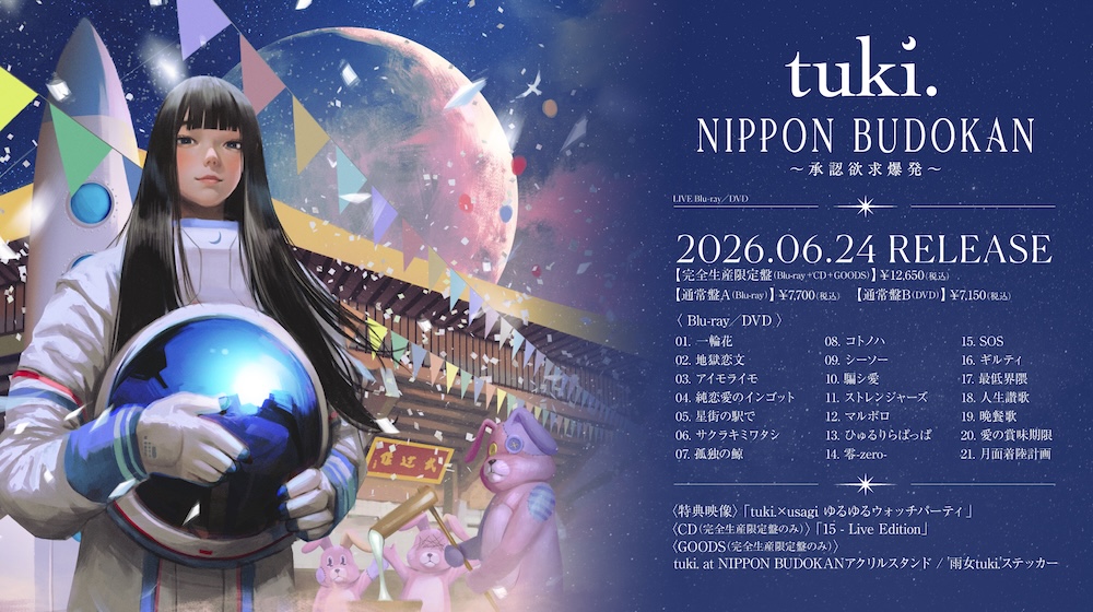 tuki.が、2026年2月に東京・ 日本武道館にて開催した自身初のワンマンライブ<NIPPON BUDOKAN 〜承認欲求爆発〜>のライブBlu-ray・DVDを6月24日に発売することを発表した。