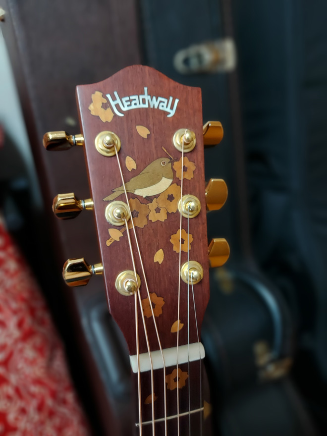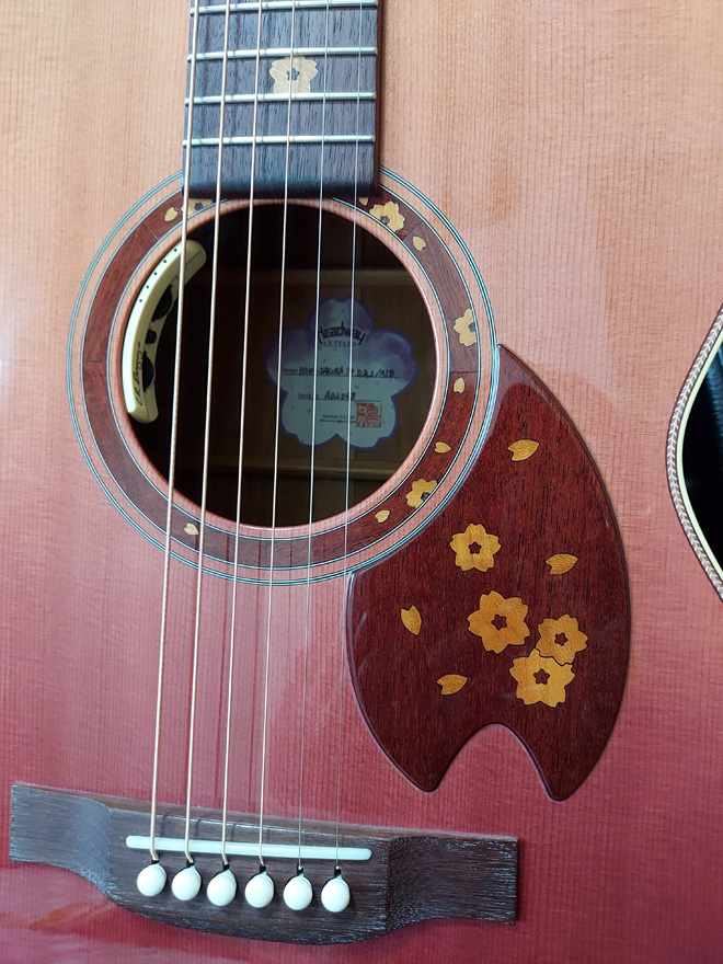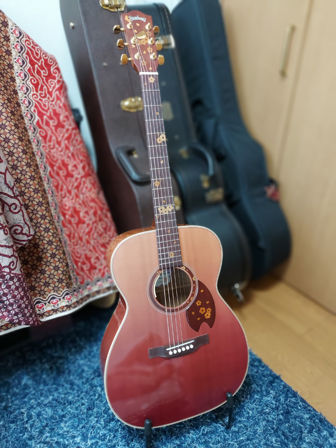 日本の木材のギターが欲しくなり桜の木に憧れました。欲しいギターにはピックアップがなくてこれではステージ向きじゃないからどうしようかと探していましたら、ピックアップを後付けした中古を見つけました。すぐに取り寄せてもらい我が家へ。