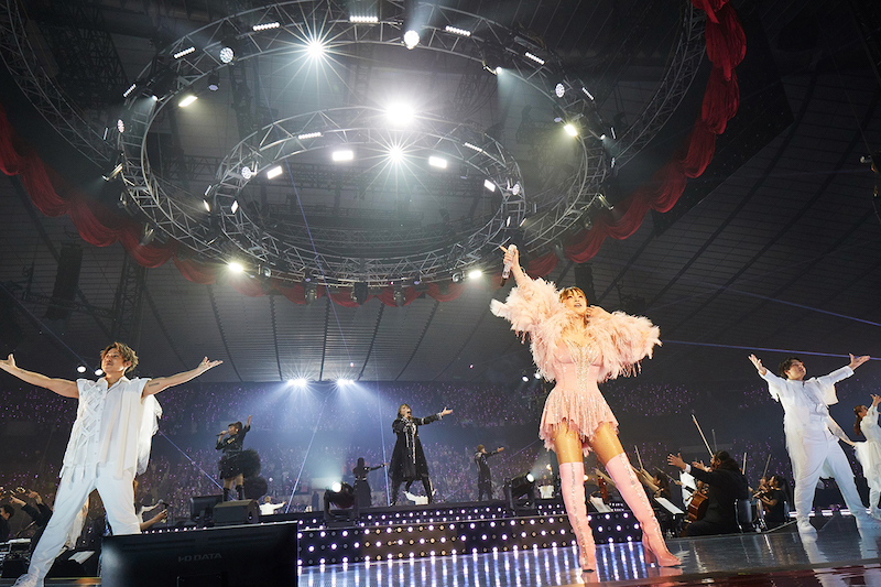 アリーナ中央に組まれたセンターステージには浜崎をはじめ、ダンサー、パフォーマー、バンド、ストリングス、コーラス、クワイヤー、獅子舞パフォーマー、総勢35名ものサポートメンバーが登場し、記念すべきアニヴァーサリーイヤーの年越しに花を添えた。