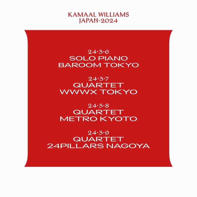 国内でのスタンディングライブは初となる東京公演を含め、アルバムからインスピレーションを得たピアノソロライブを含めた4つの異なる公演を開催。音符とメロディの総和を超えさらに深化したカマール・ウィリアムスのパフォーマンスは必見だ。