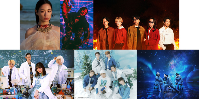 Mrs. GREEN APPLEは、山田涼介主演の話題の映画主題歌として書き下ろした「ナハトムジーク」をフルサイズテレビ初歌唱。関ジャニ∞は通算50枚目のシングルで、新時代のヒットメーカー・キタニタツヤが作詞作曲を担当した「アンスロポス」をフルサイズでパフォーマンスする。また、DXTEENはウィンターソング「Snowin’」を、Awichは最新アルバム「THE UNION」より「かくれんぼ」をフルサイズで披露する。