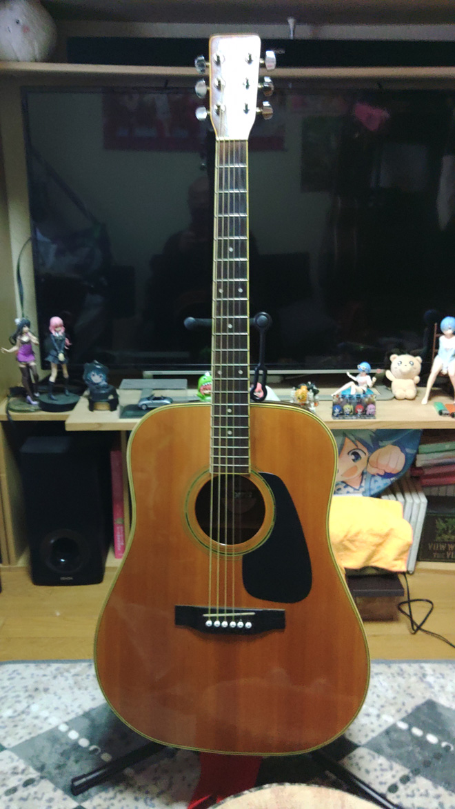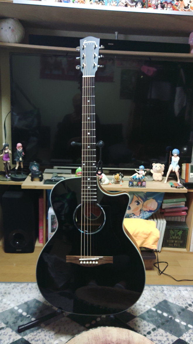 あれからフルアコは楽しく弾いているんですけれど、やはりアコギの生音も楽しみたくなり高校時代に初めて手にしたMorrisのMD-511を送ってもらいました。しかし、ネックにはクラックが入っており、さらに反っていて、フレットもずいぶん磨耗していました。とりあえず弾けるって状態。しばらくは我慢してましたが、やっぱり我慢出来ずミニアコか安いアコギでもと思い楽器屋さんへ。