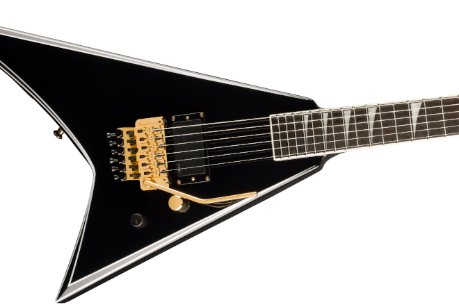 人間工学に基づいたカーブを描くポプラボディに、スカーフジョイントヘッドストックと内蔵グラファイト補強ロッドを採用したメイプルスルーネック。24 本のジャンボフレットを配した12~16 インチコンパウンドラジアス仕様のバウンドローレル指板は、ナット付近ではコード弾きやリズムプレイに最適な丸みを帯び、ハイポジションに近づくにつれてフラットな形状に変化し、ネック全長にわたりコード弾きからソロプレイまで、快適な演奏を実現。高出力Jacksonブリッジハムバッカーと、レールスタイルのネックピックアップは、クランチ感のあるフルボディトーンを奏で、3 ウェイブレードスイッチ、1 ボリューム、1 トーンといったコントロールにより、アグレッシブなリズムプレイからリードプレイまで対応する幅広いサウンドメイキングが可能。Floyd Rose Special ダブルロッキングトレモロは、大胆なアーミングを行なってもチューニングの安定性を堅牢に維持。カラーは、Red with Black Cross Daggers。